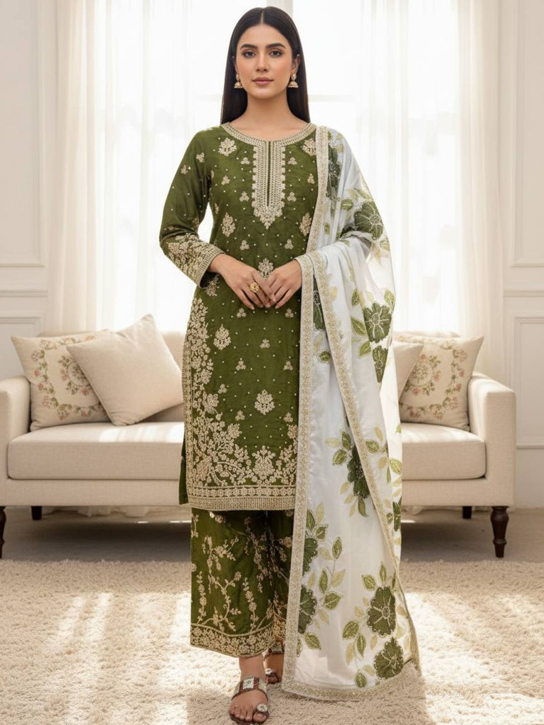 Green color Salwar Kameez in Silk fabric with Embroidered, Sequence, Thread work