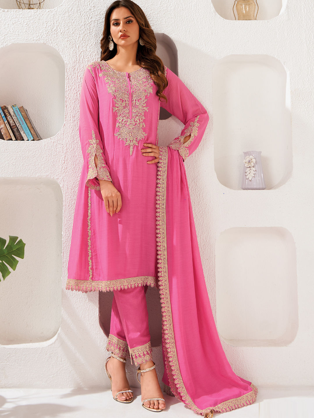 Silk Festive Salwar Kameez in Pink and Majenta with Thread work