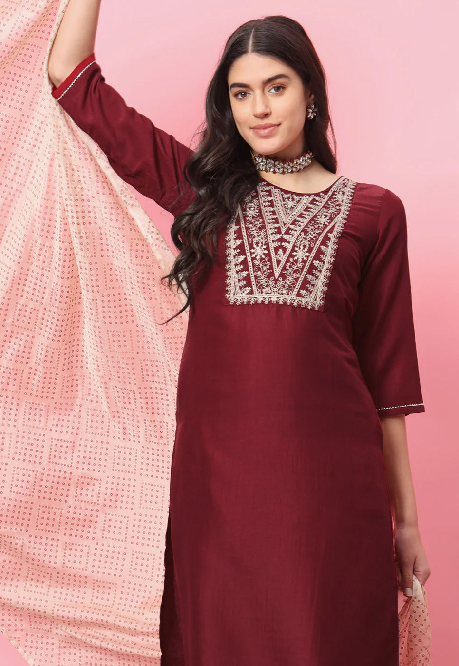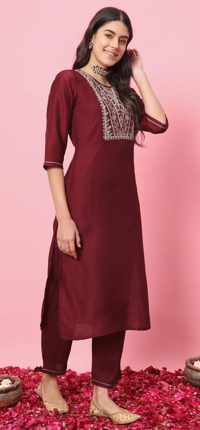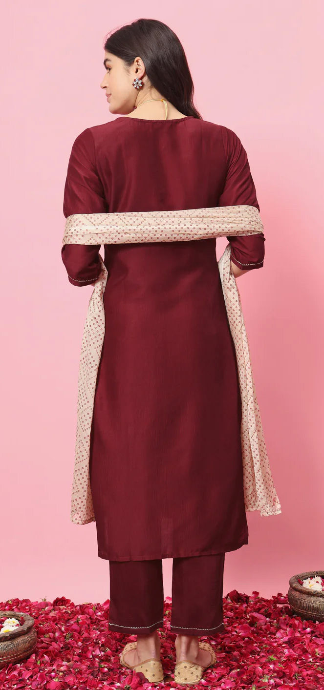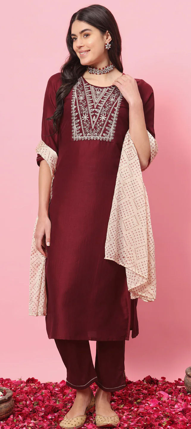 Red and Maroon color Salwar Kameez in Blended, Silk fabric with Embroidered, Thread work