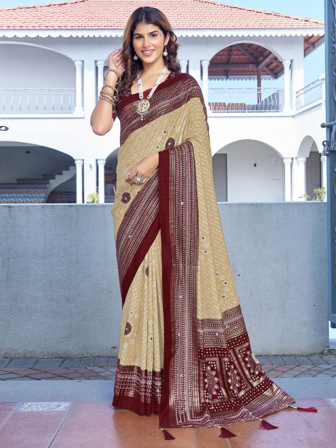 Beige and Brown, Red and Maroon color Saree in Silk fabric with Bandhej, Printed work