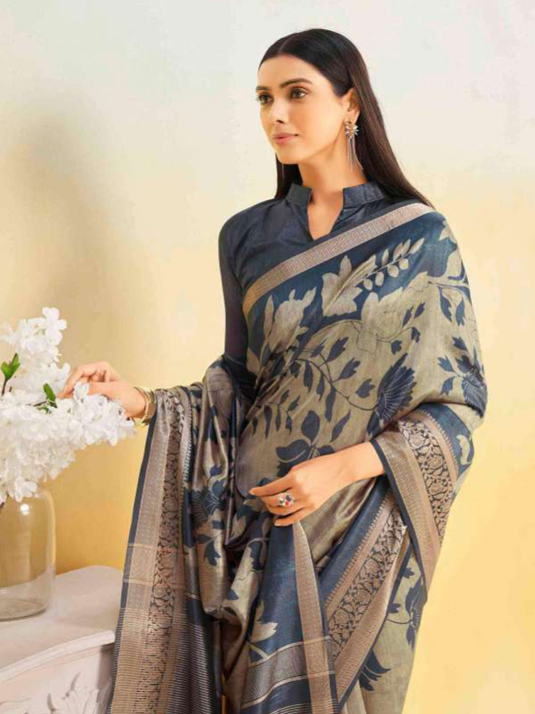 Beige and Brown, Blue color Saree in Silk fabric with Floral, Printed, Weaving work
