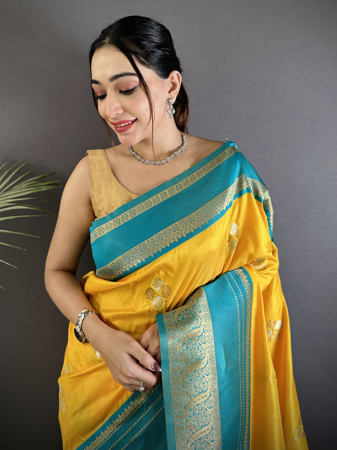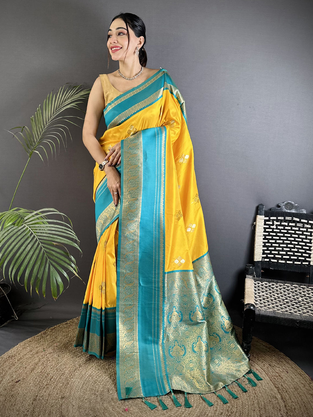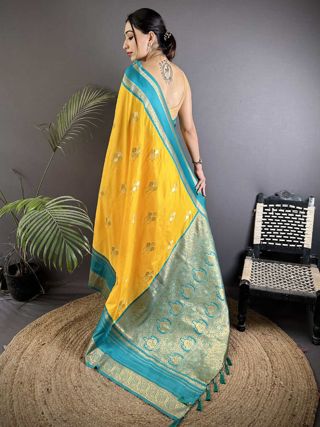 Blue, Yellow color Saree in Silk fabric with Weaving work