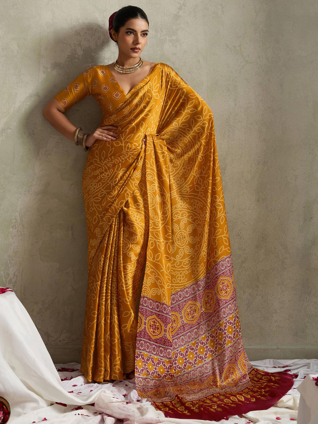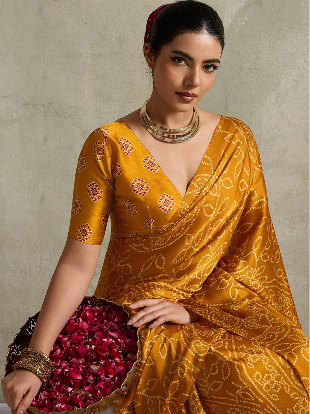 Yellow color Saree in Silk fabric with Bandhej, Printed work