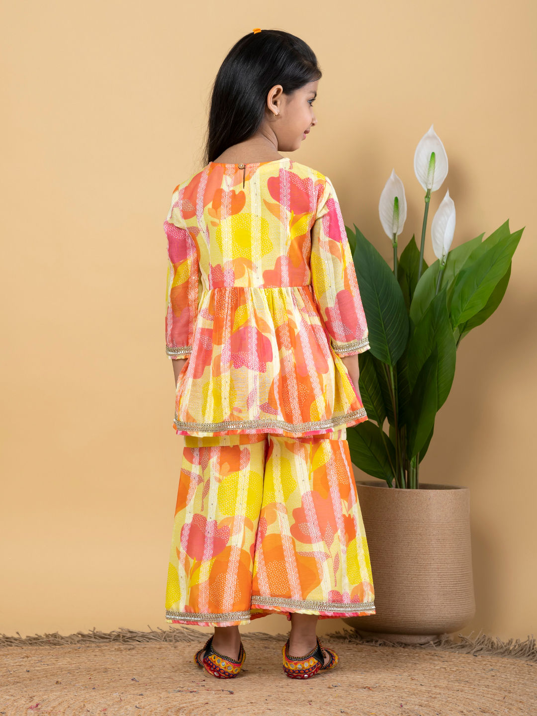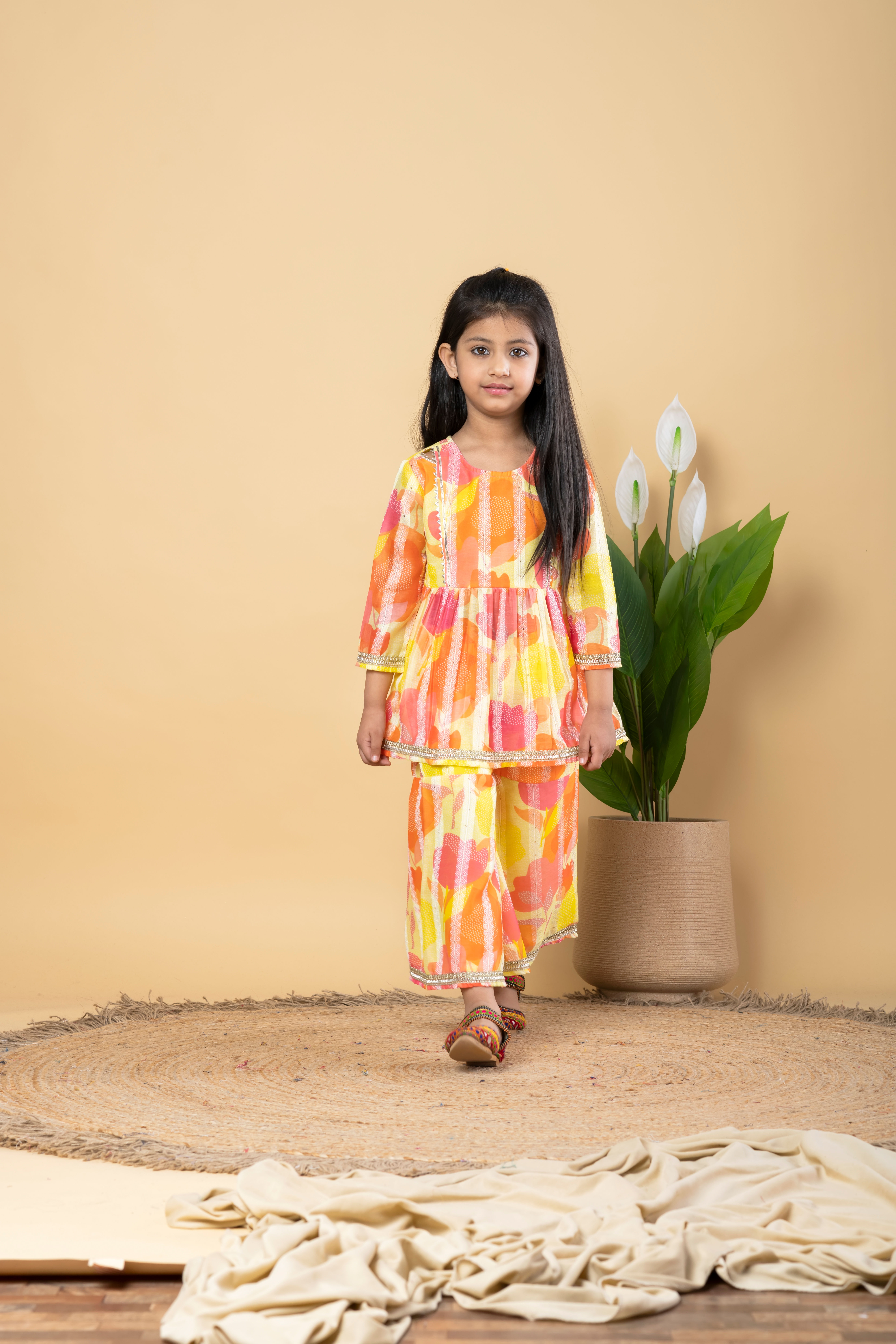 Yellow color Girls Top with Bottom in Silk fabric with Gota Patti, Printed work