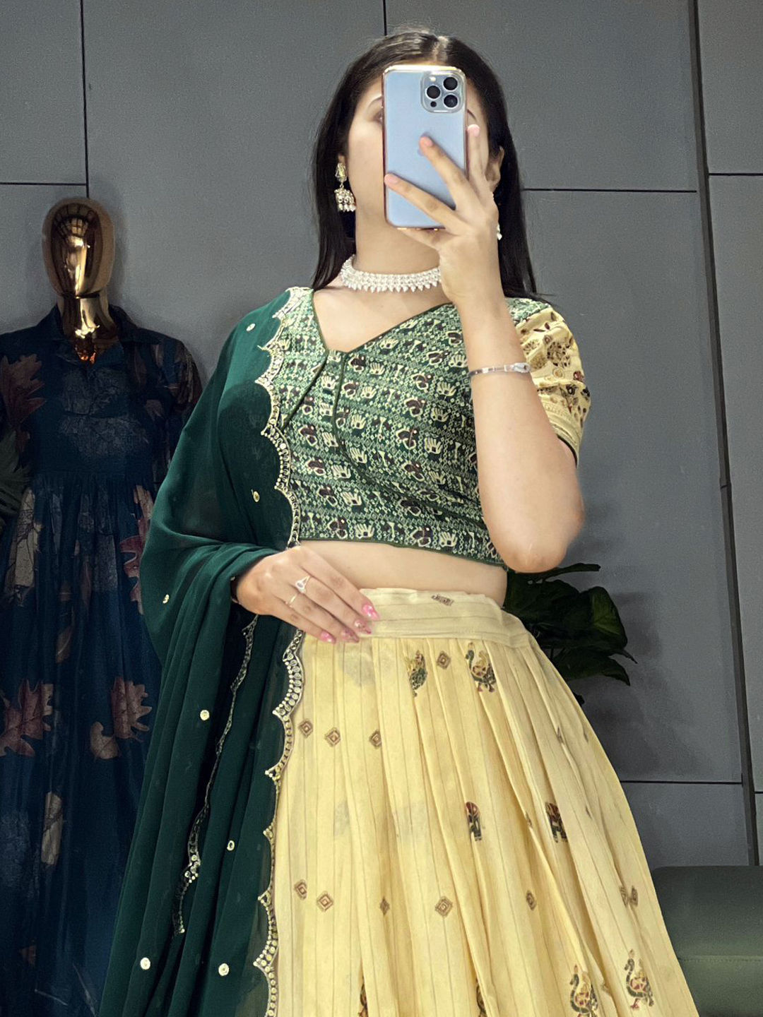 Yellow color Lehenga in Silk fabric with Printed, Weaving work