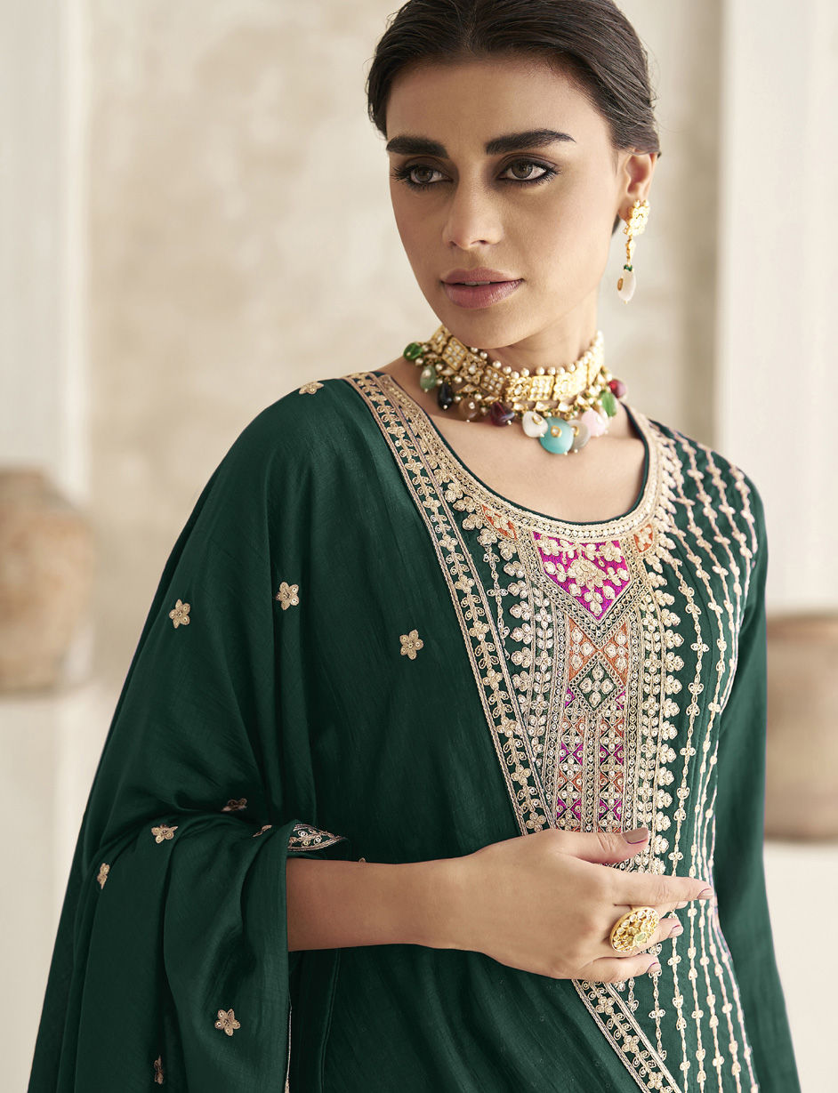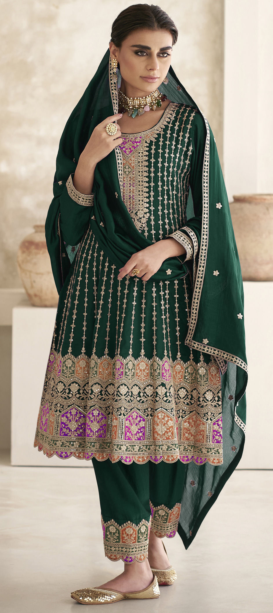 Green color Salwar Kameez in Silk fabric with Embroidered, Sequence, Thread, Zari work