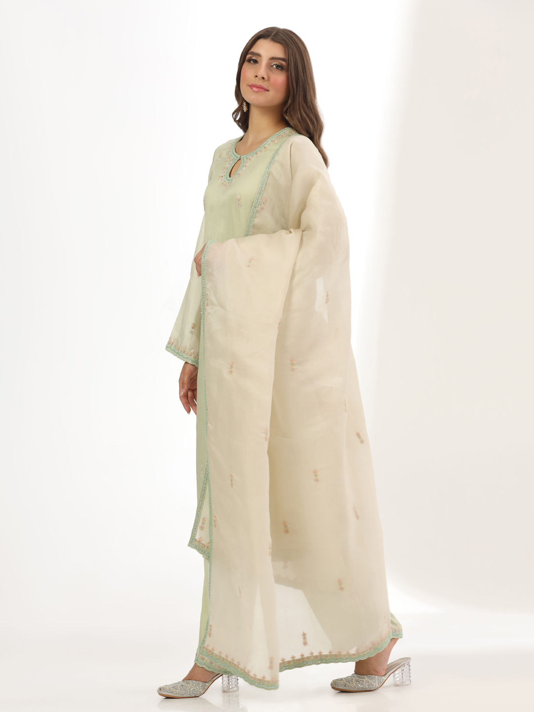 Organza Silk Festive Salwar Kameez in Green with Cut Dana work