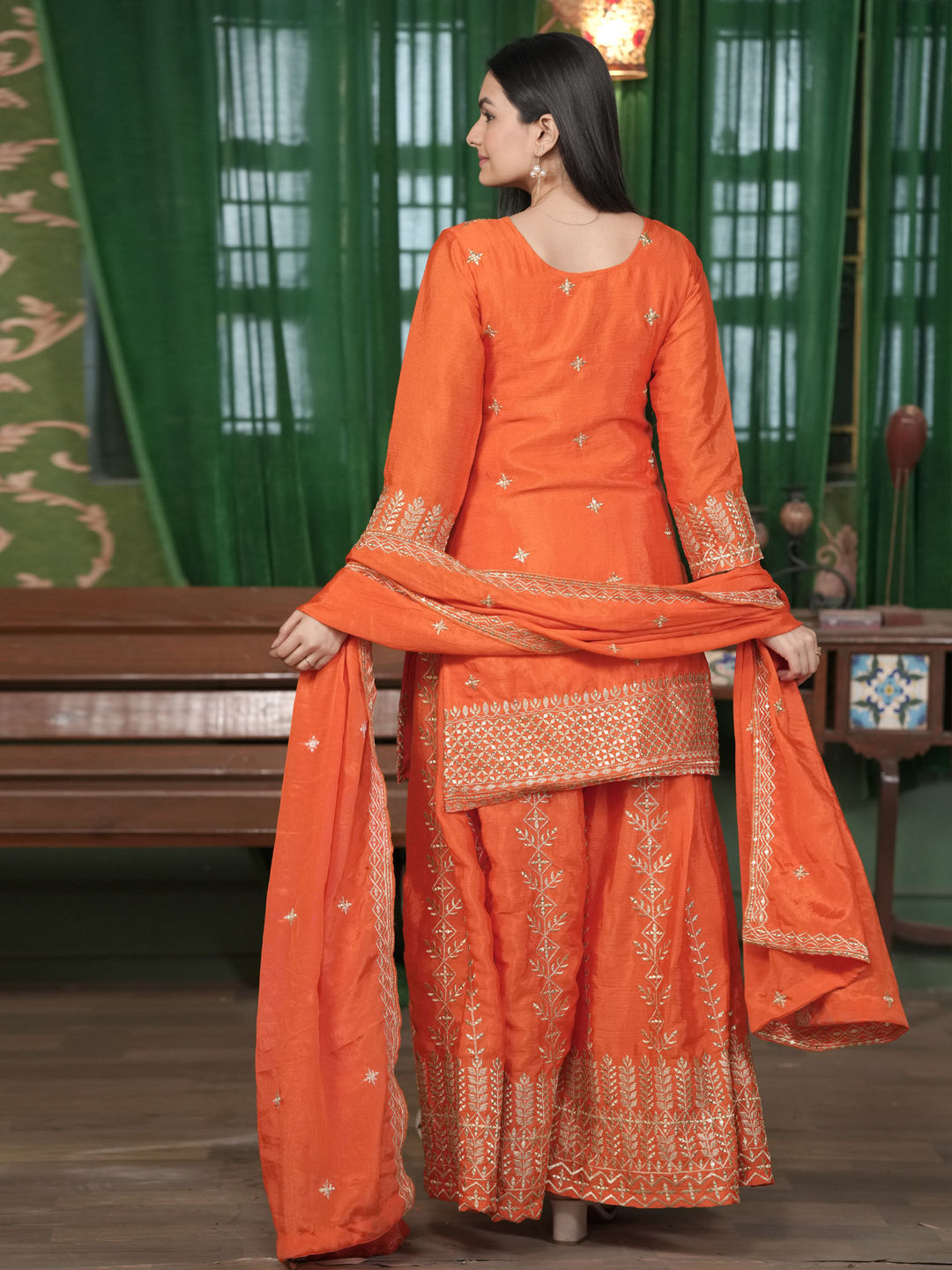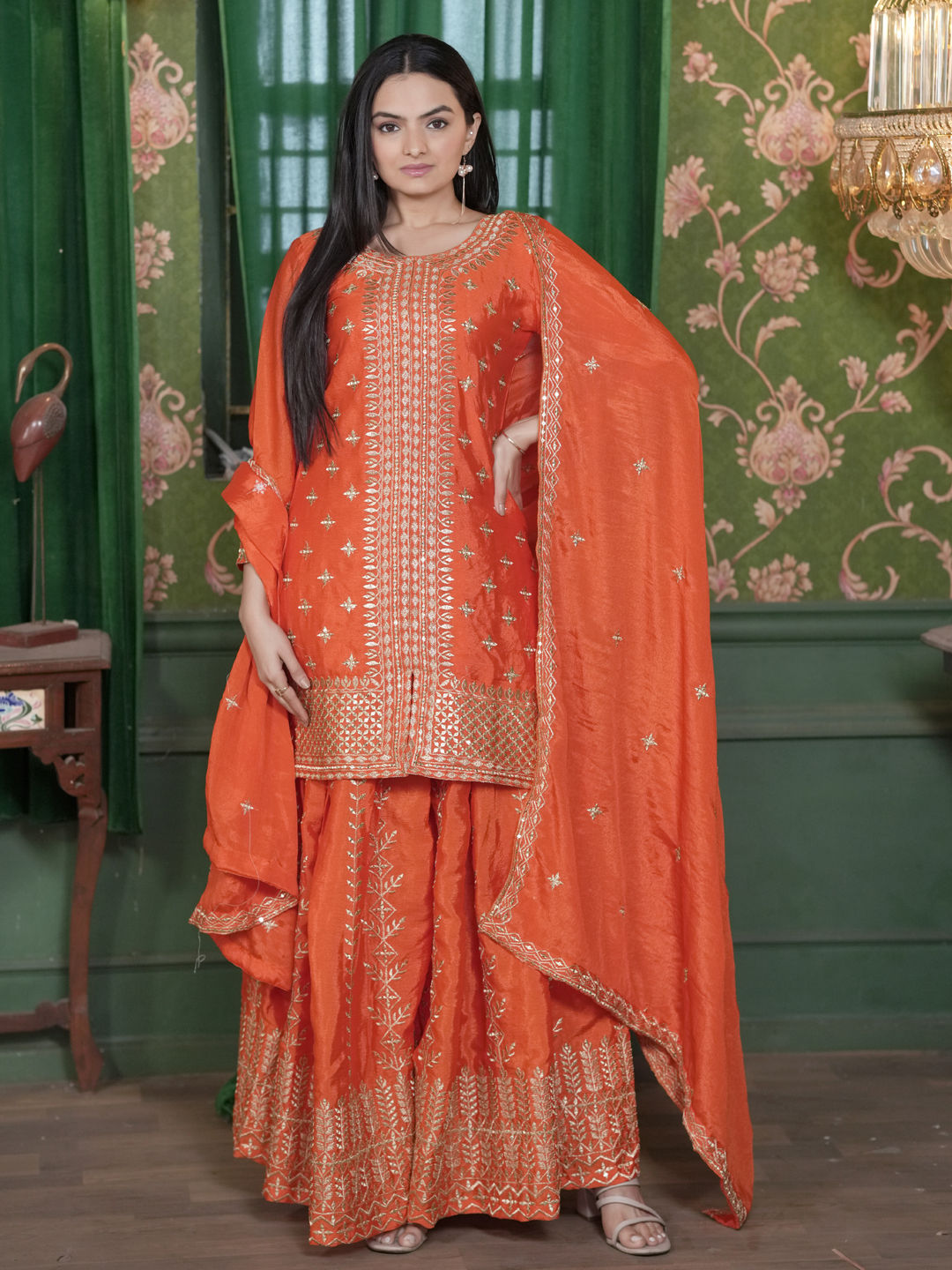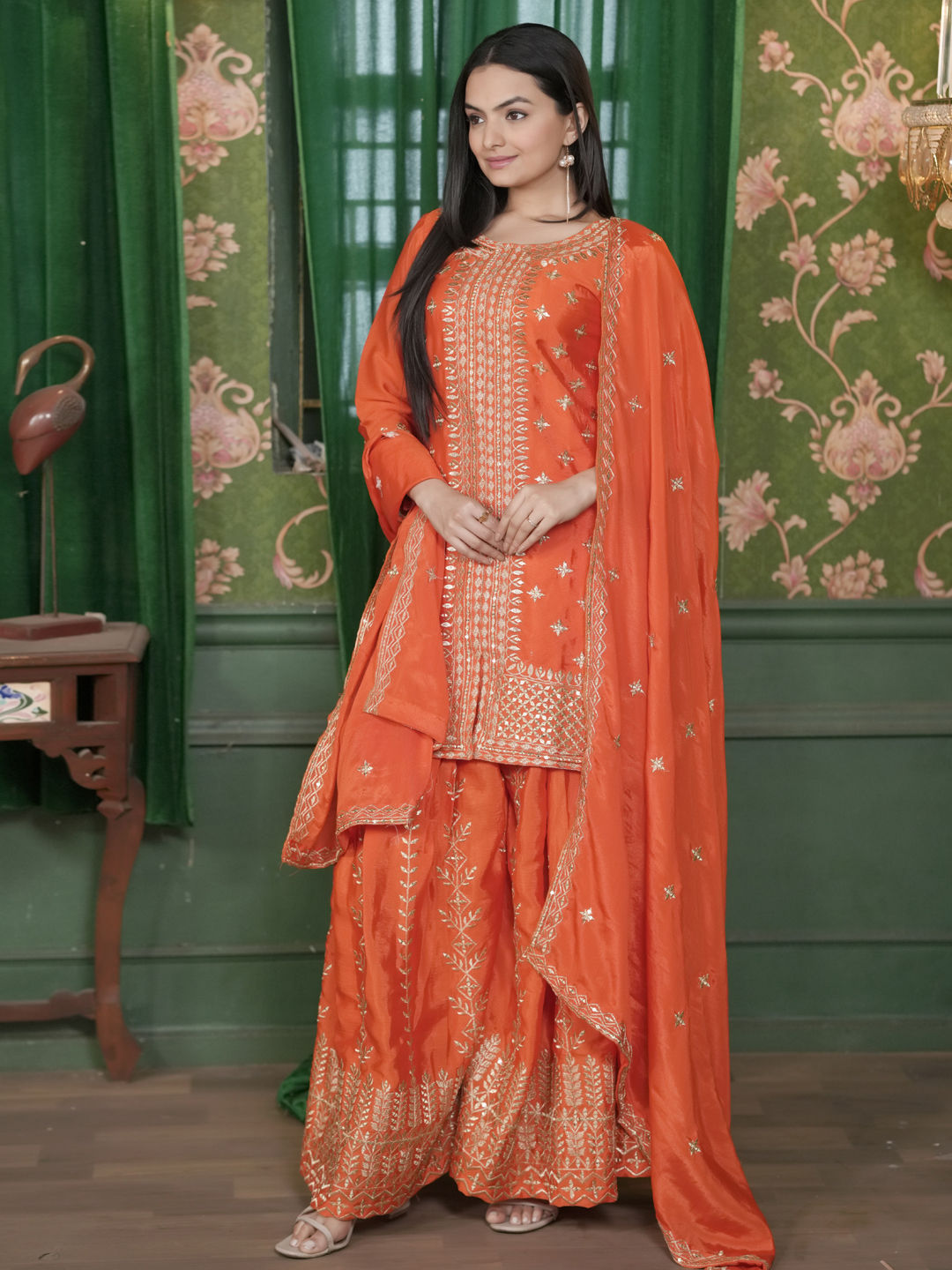 Orange color Salwar Kameez in Silk fabric with Embroidered, Sequence, Thread work