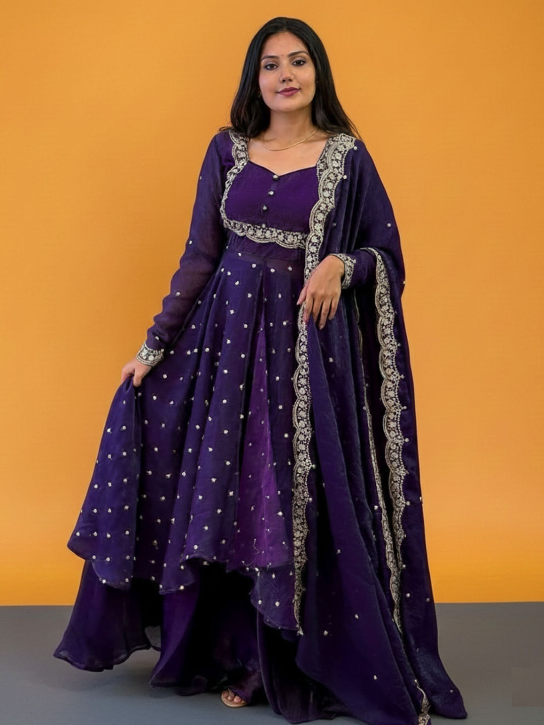 Purple and Violet color Salwar Kameez in Silk fabric with Embroidered, Sequence, Thread work