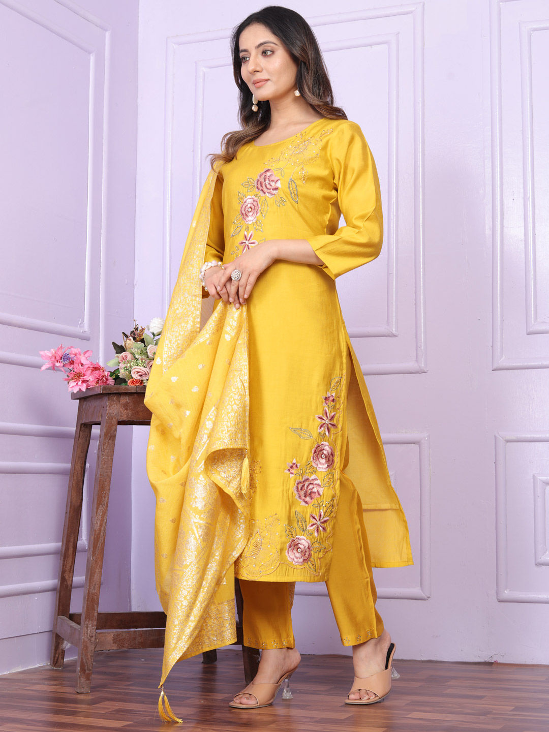 Yellow color Salwar Kameez in Silk fabric with Bugle Beads, Embroidered, Sequence, Thread work