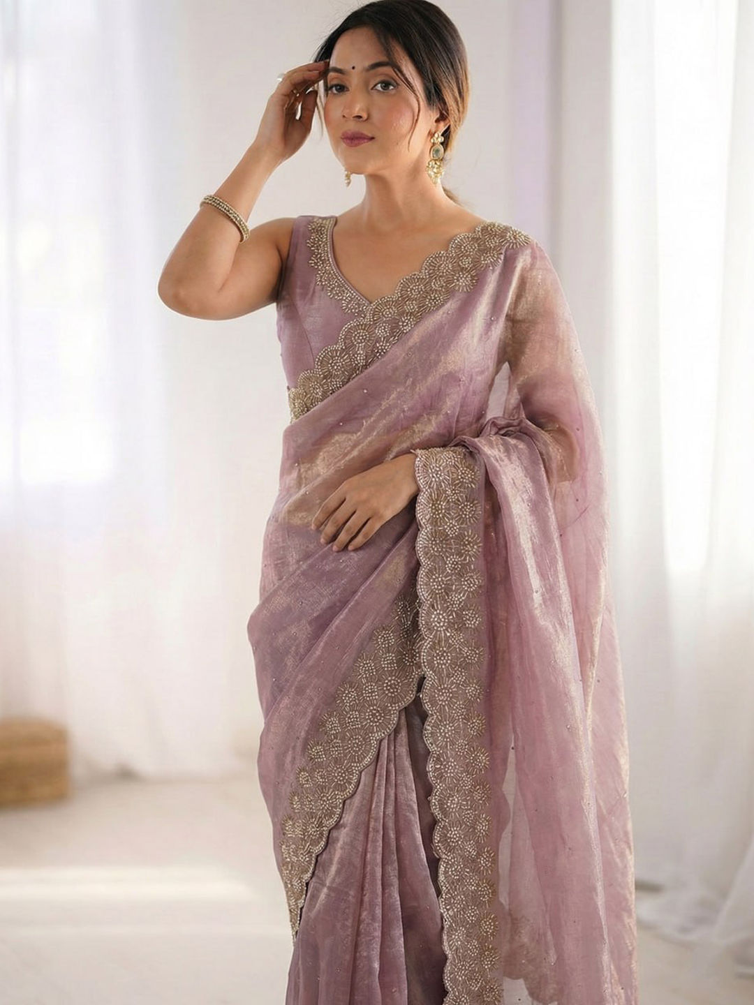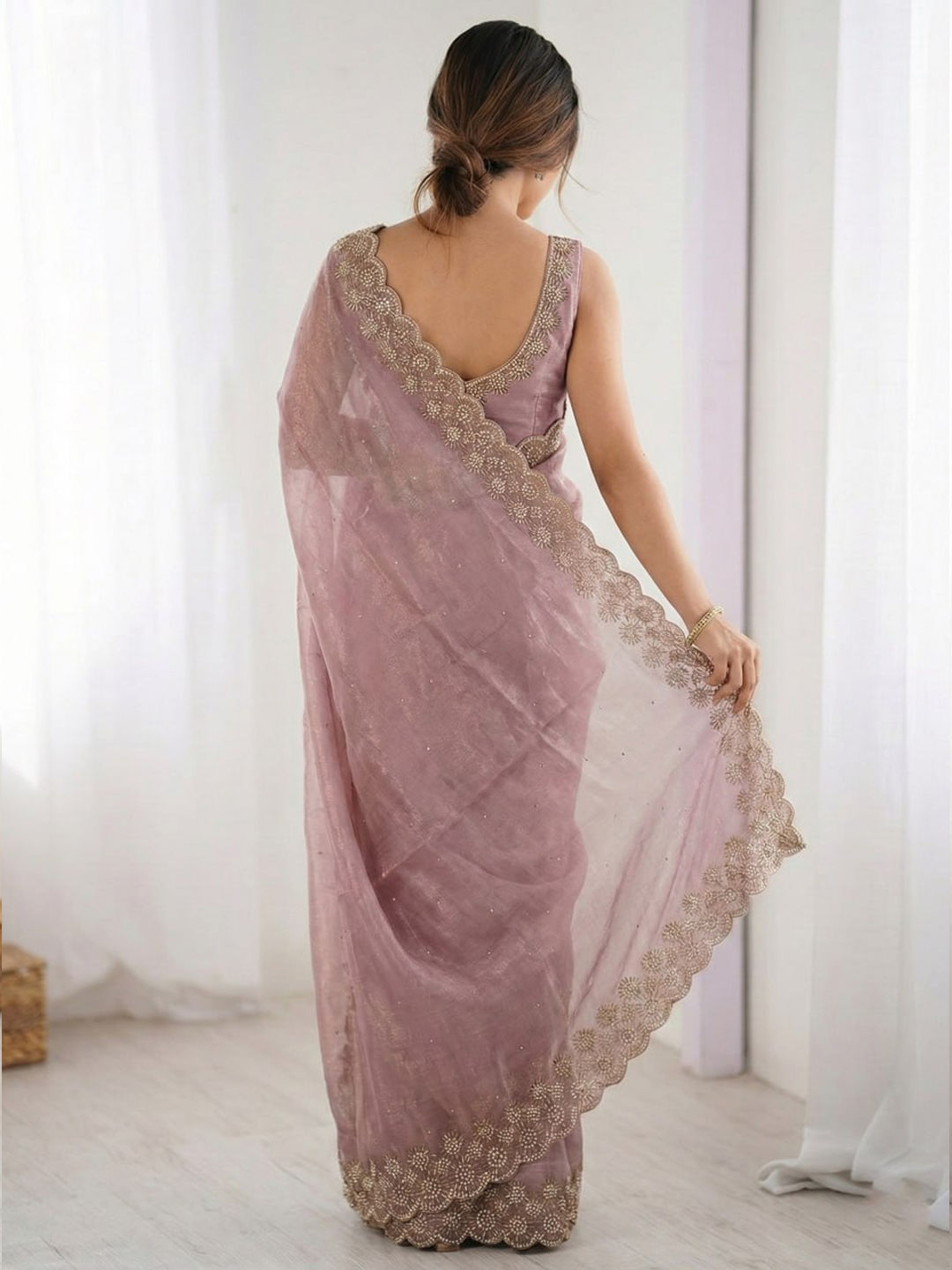 Beige and Brown color Saree in Silk fabric with Stone, Swarovski work