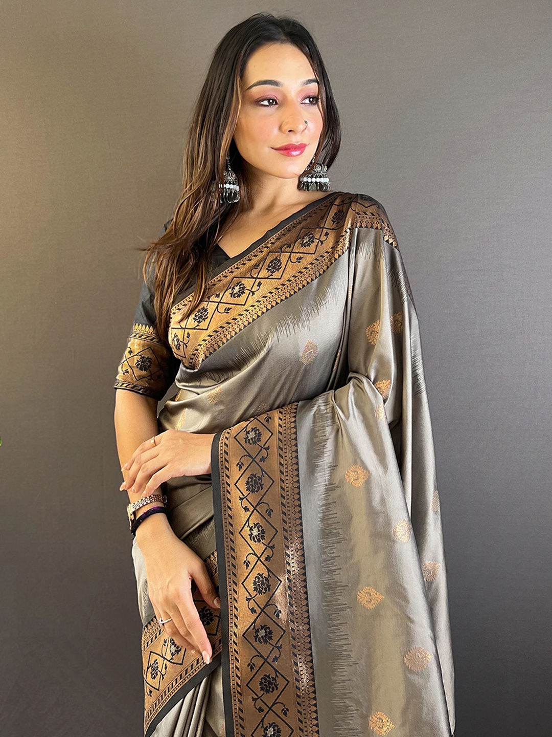 Black and Grey color Saree in Silk fabric with Weaving work