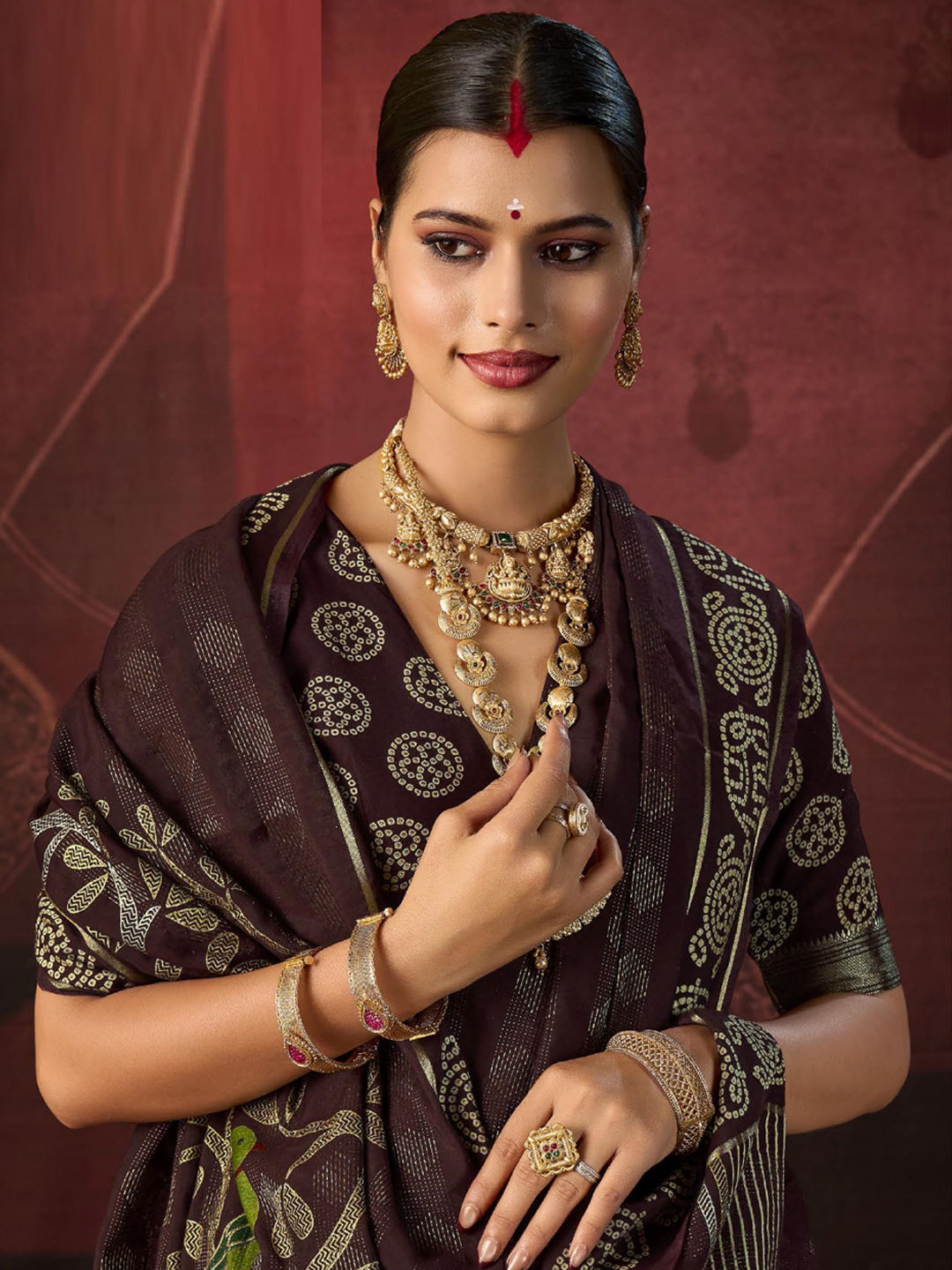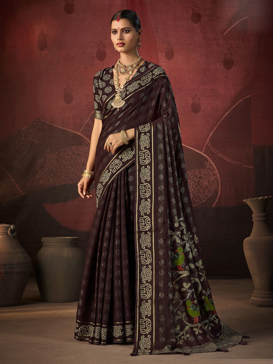 Silk Festive Saree in Beige and Brown with Bandhej work