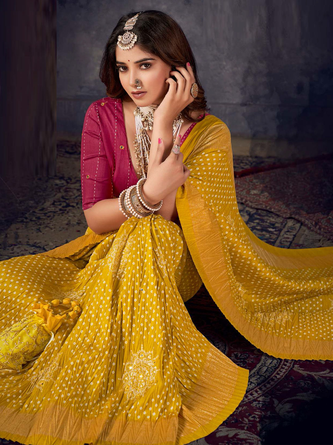 Silk Festive Saree in Pink and Majenta with Bandhej work
