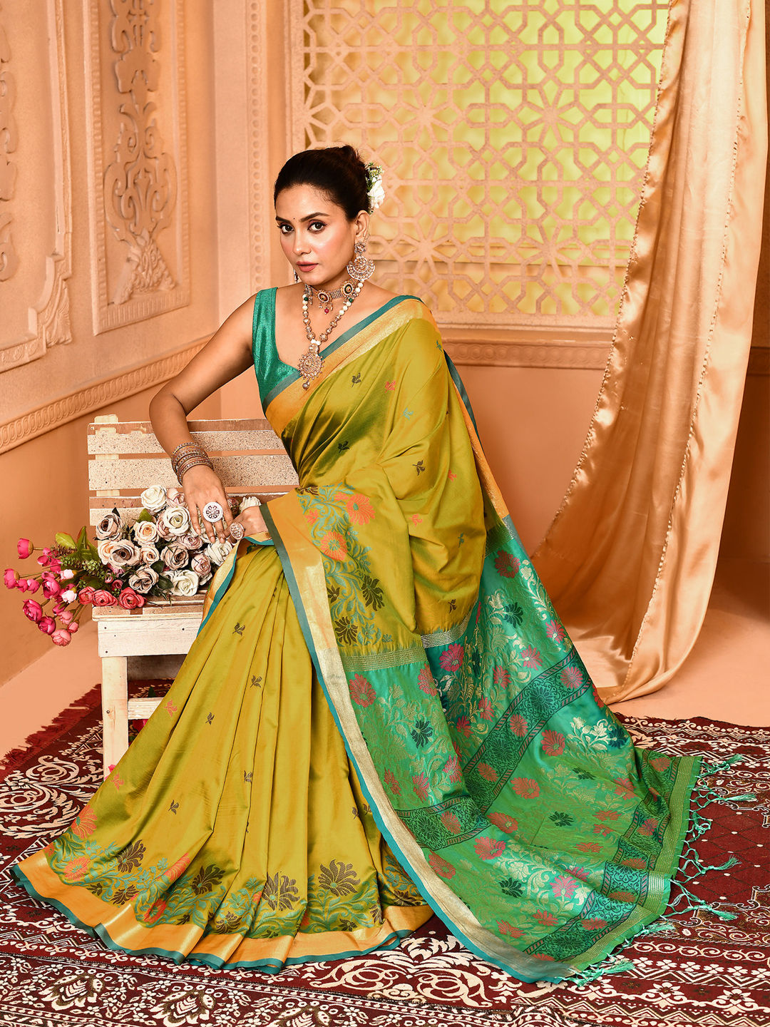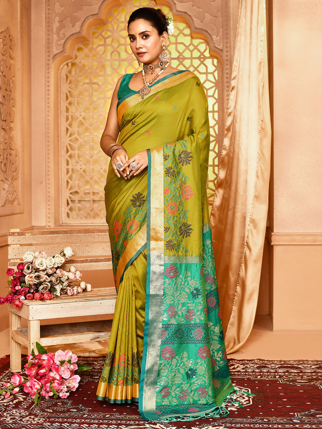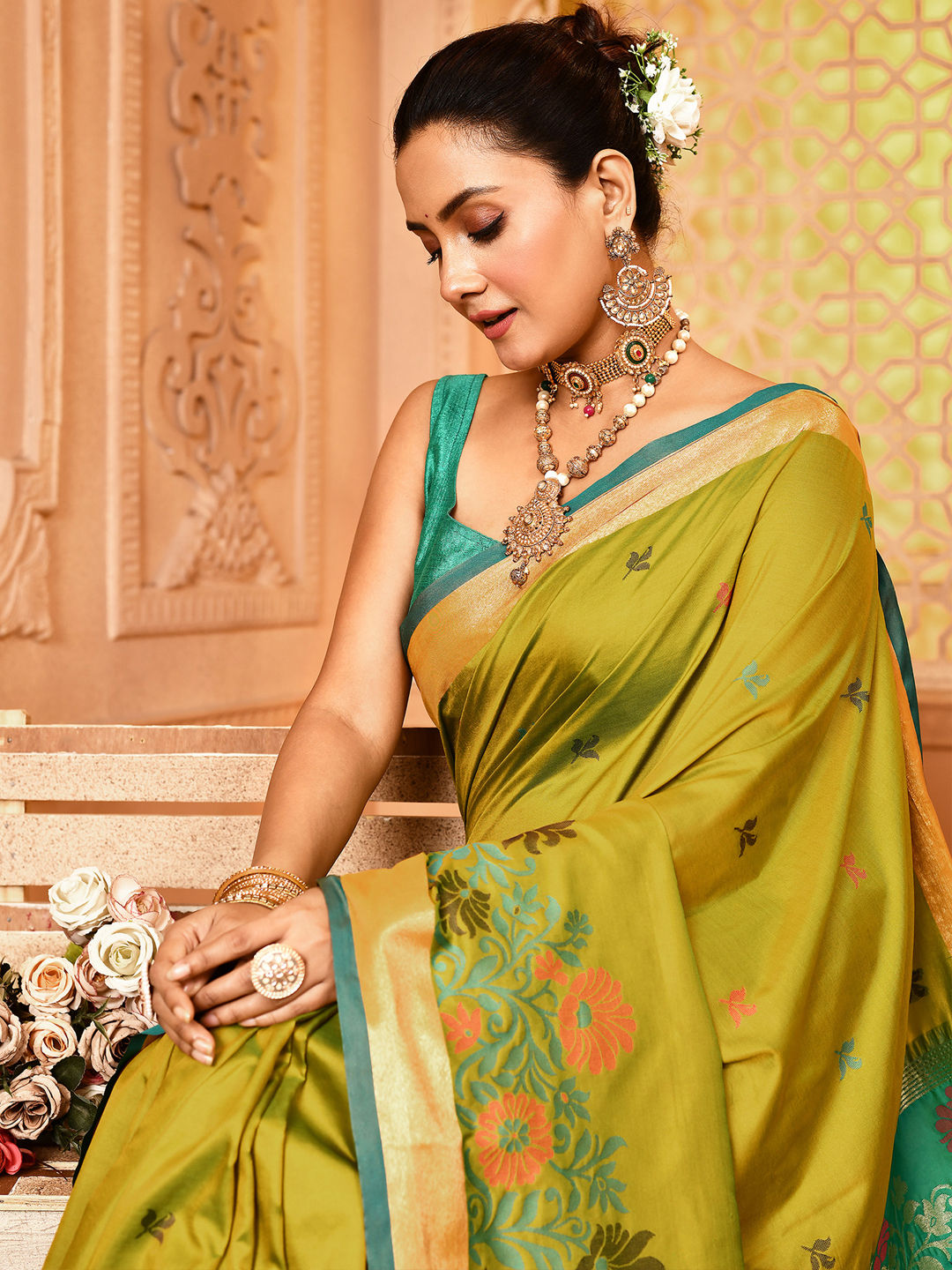 Green color Saree in Silk fabric with Weaving work
