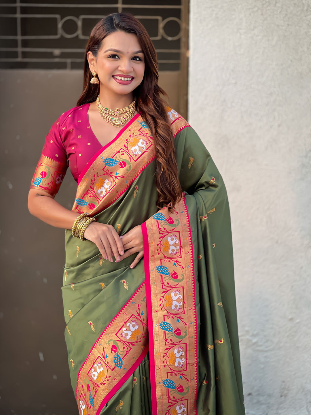 Green color Saree in Silk fabric with Weaving work