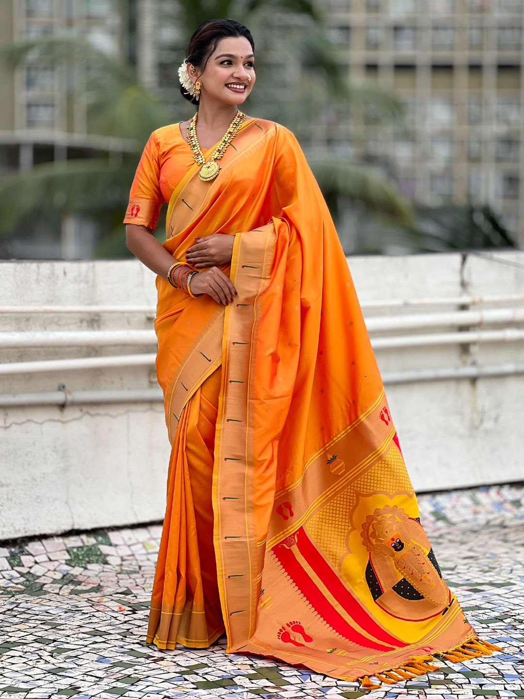 Orange color Saree in Silk fabric with Weaving work