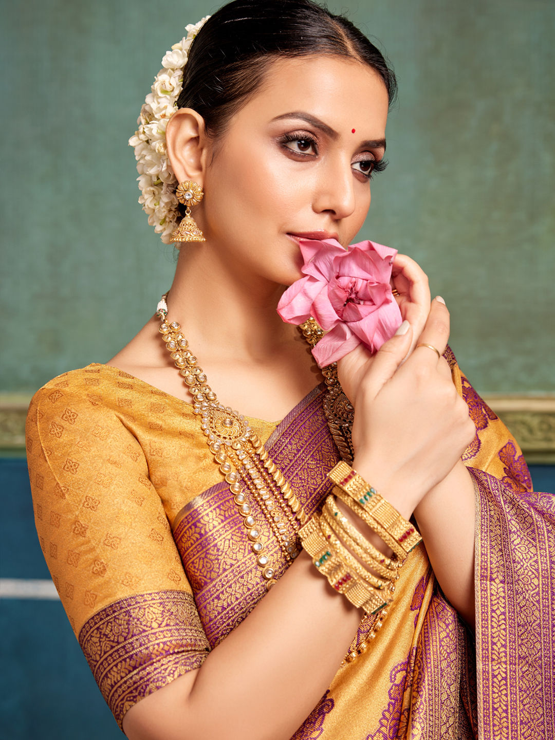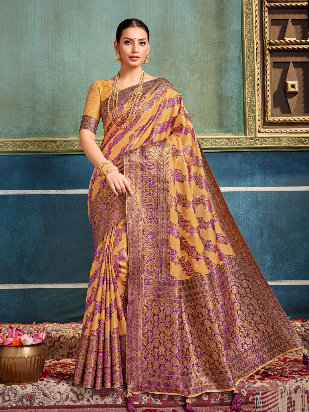 Gold, Pink and Majenta color Saree in Silk fabric with Weaving work