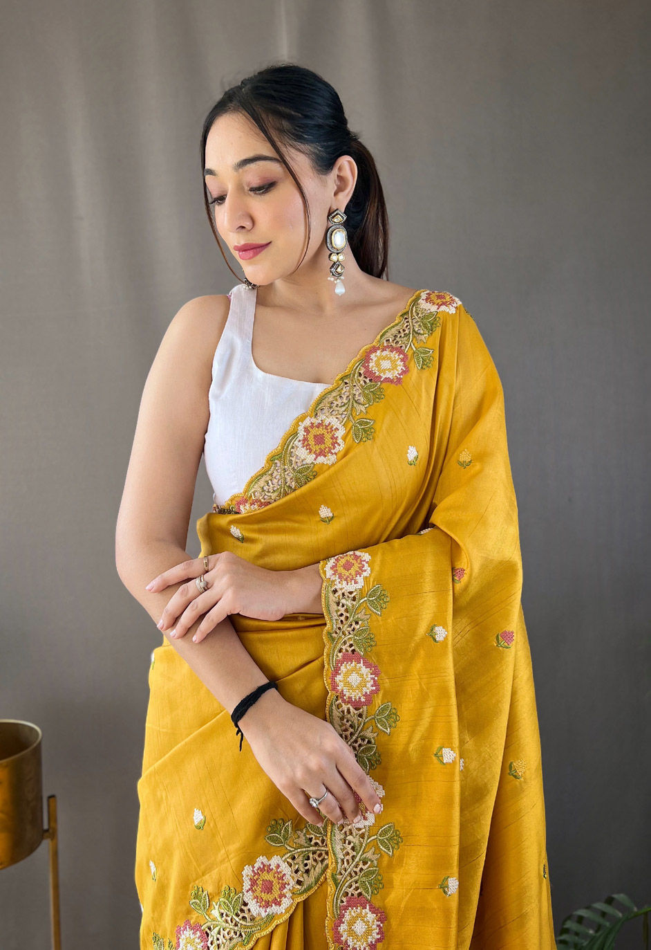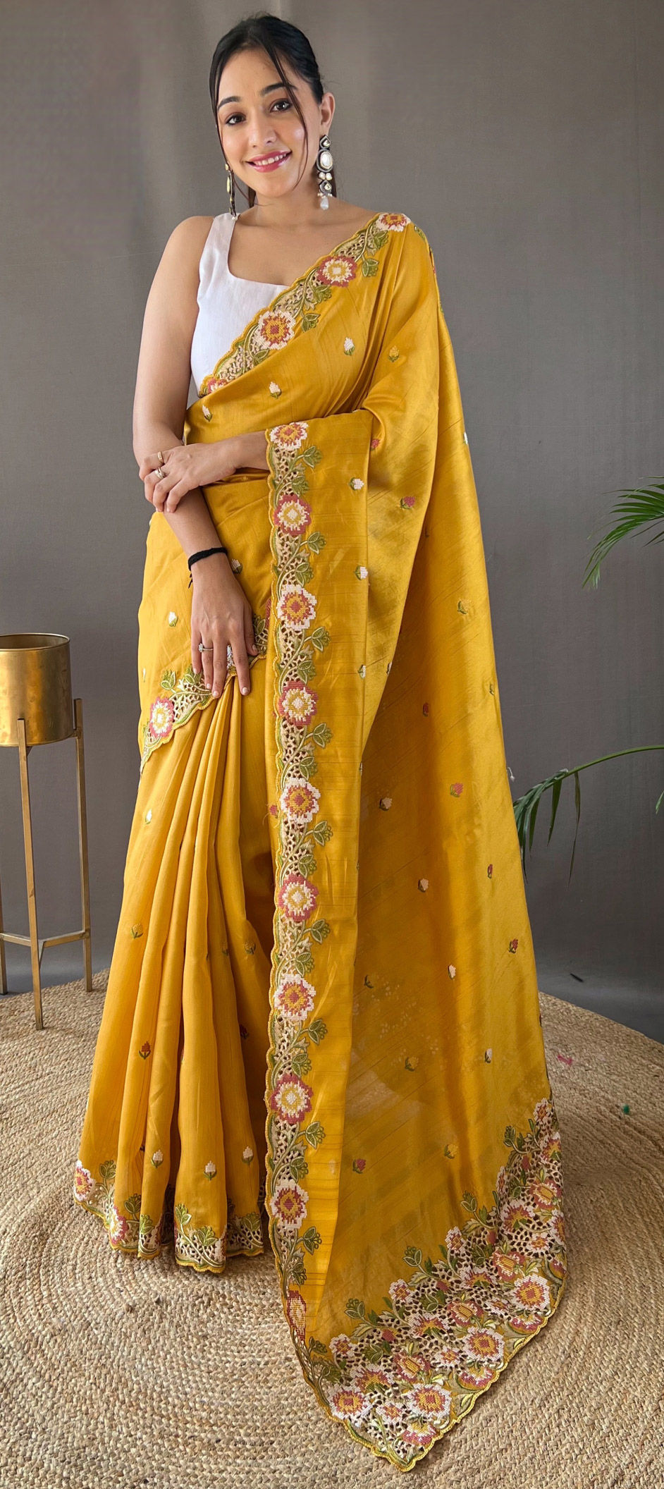 Yellow color Saree in Silk fabric with Embroidered, Resham, Thread work