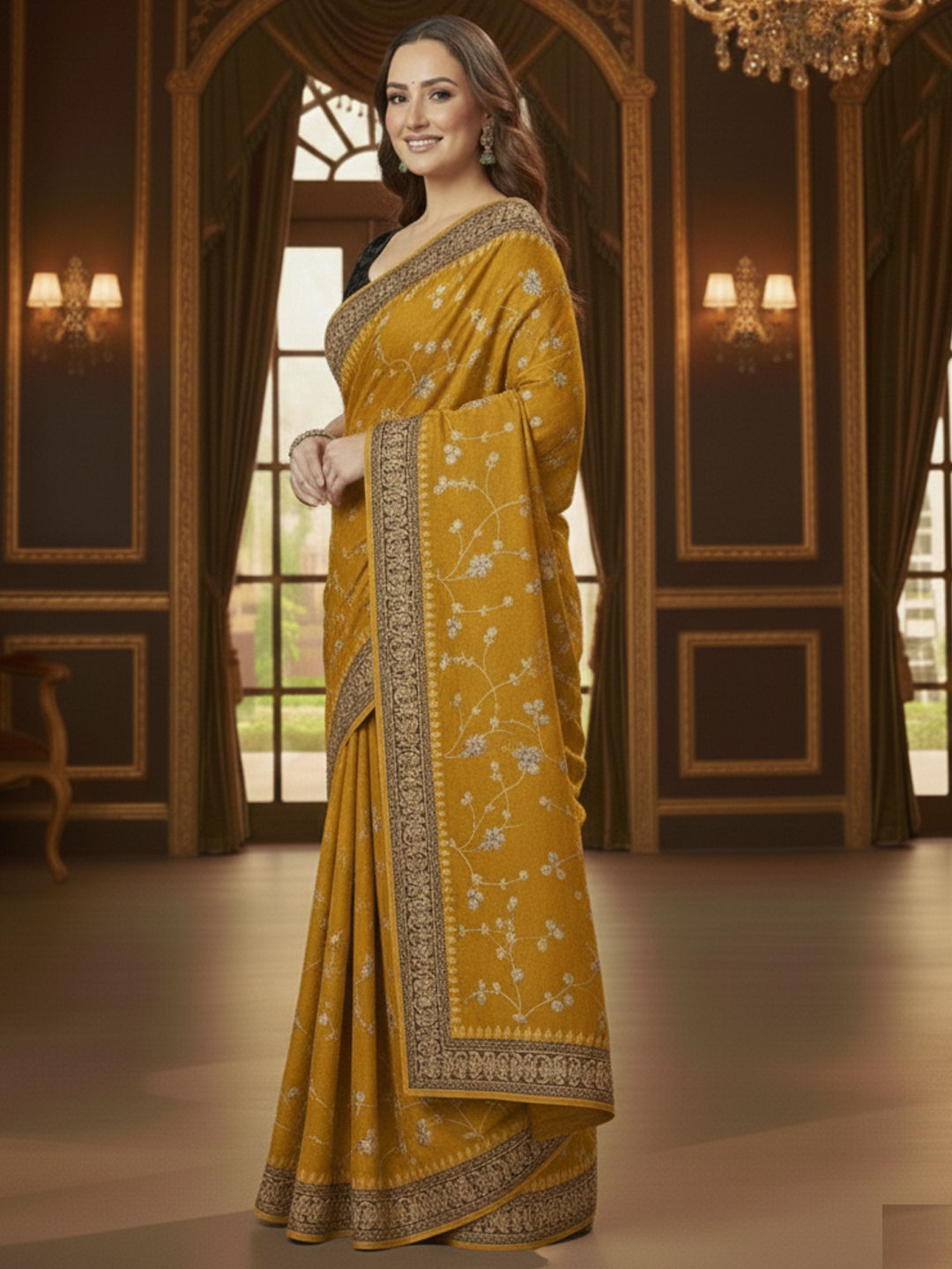 Yellow color Saree in Silk fabric with Embroidered, Sequence, Zari work