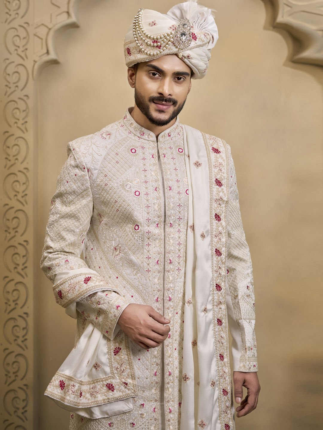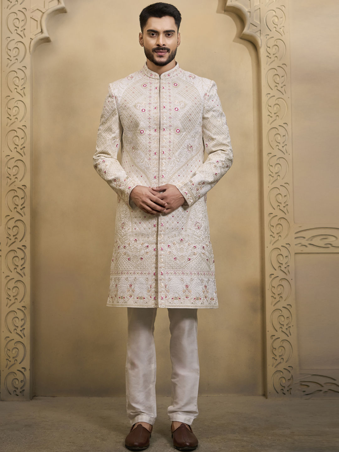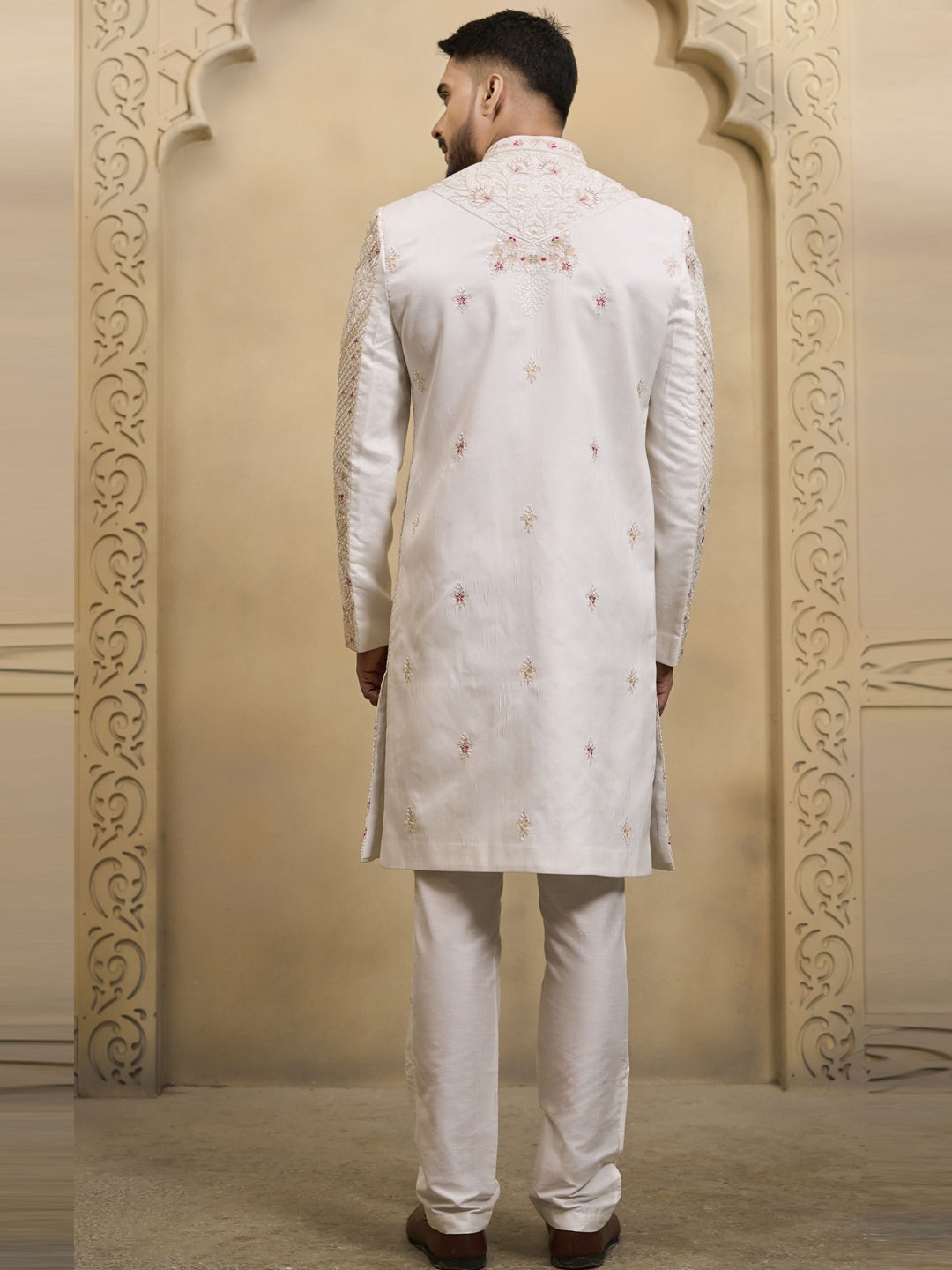 White and Off White color Sherwani in Silk fabric with Embroidered, Sequence work