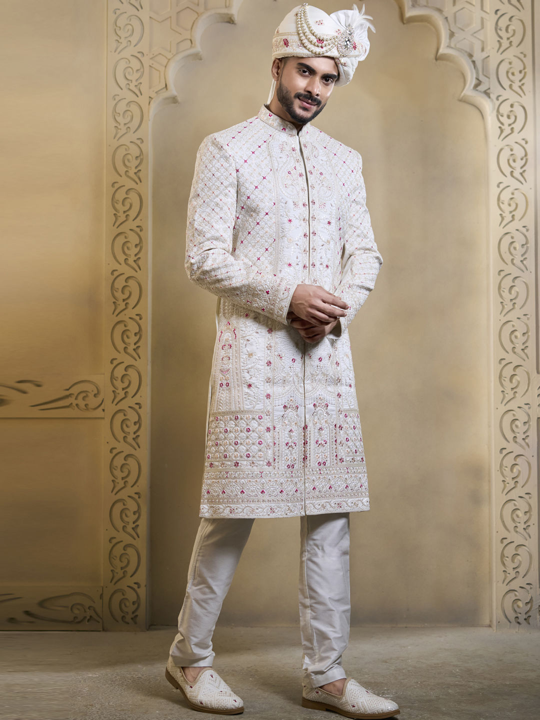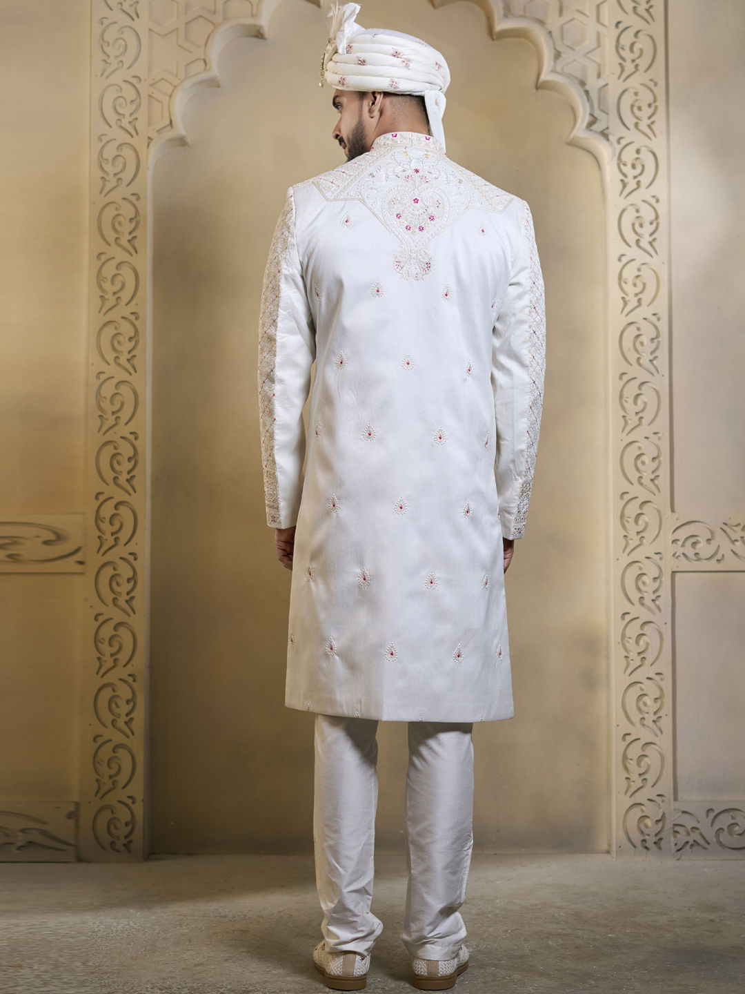 White and Off White color Sherwani in Silk fabric with Embroidered, Sequence work