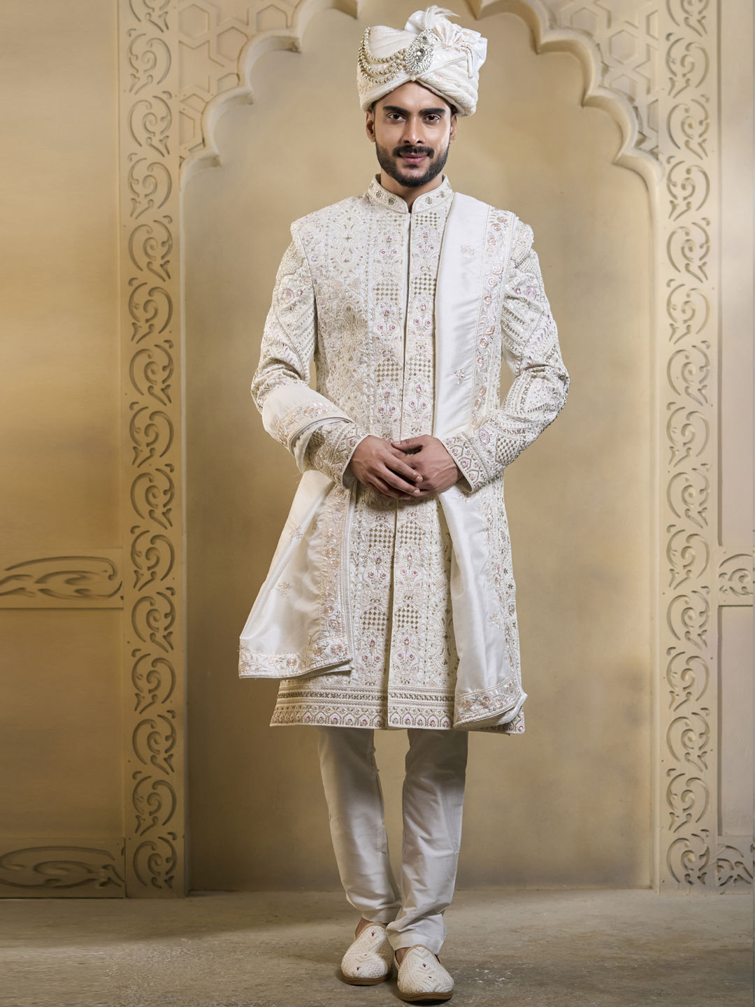 White and Off White color Sherwani in Silk fabric with Embroidered, Sequence work
