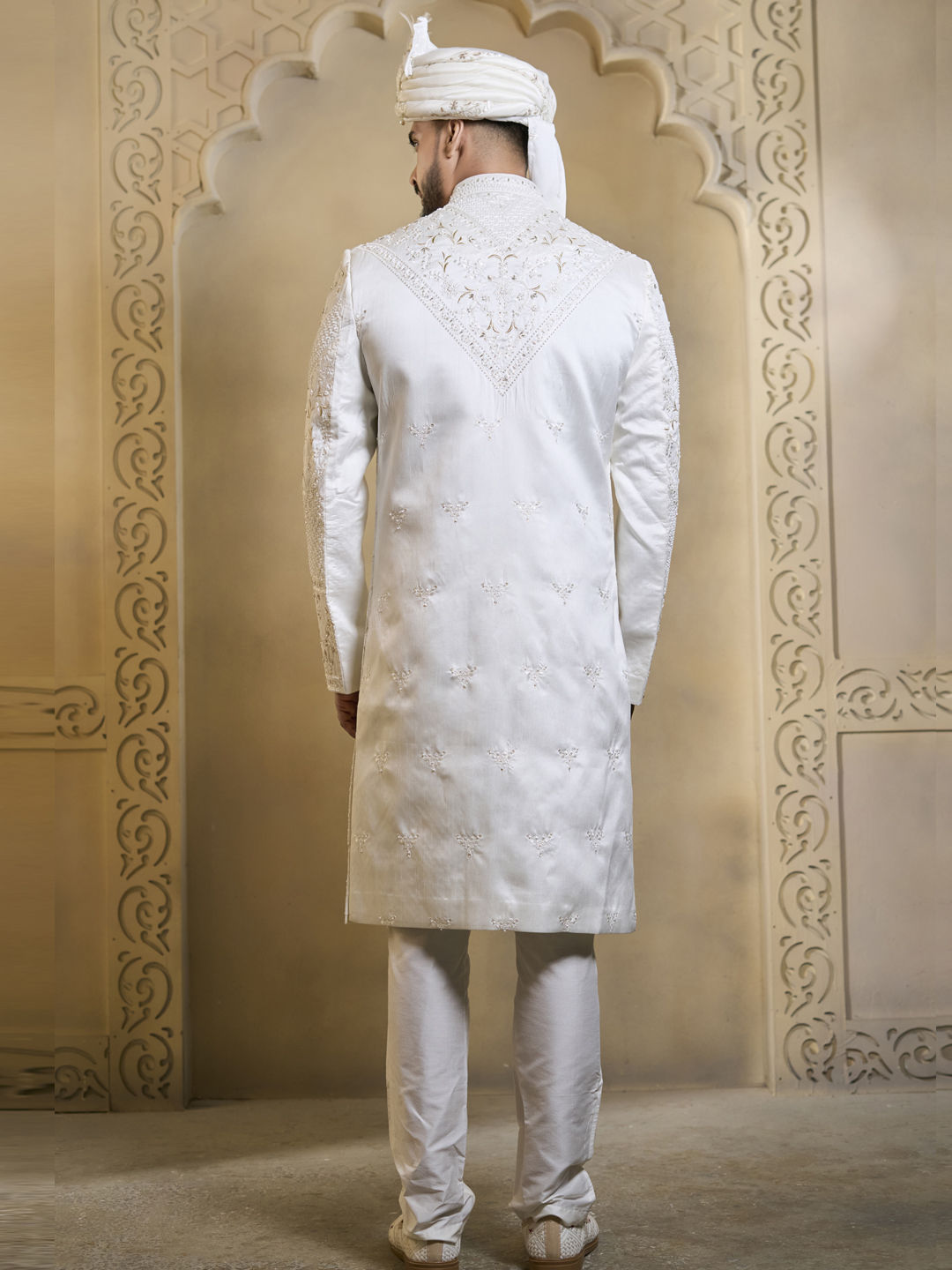 Silk Reception Sherwani in White and Off White with Embroidered work
