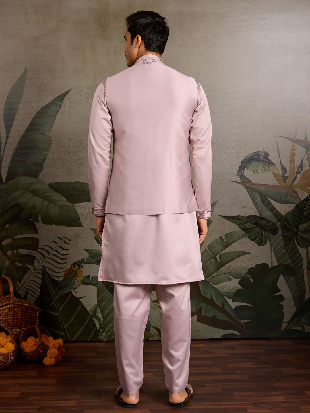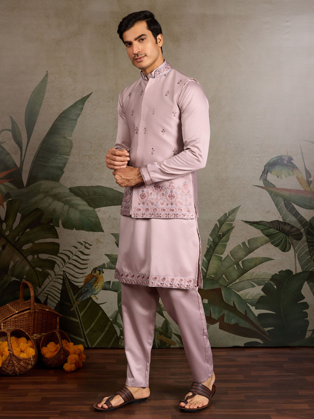 Silk Festive Kurta Pyjama with Jacket in Purple and Violet with Embroidered work