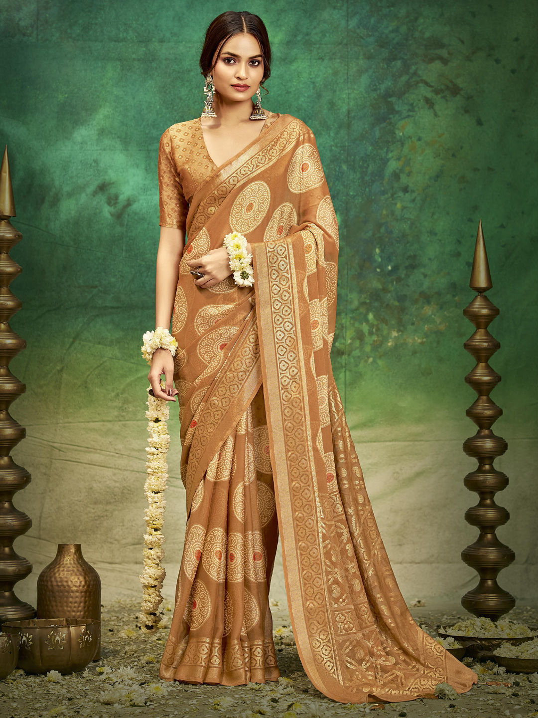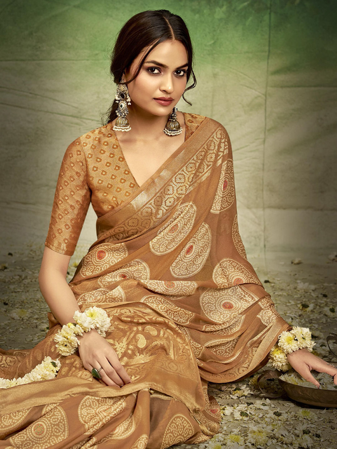 Beige and Brown color Saree in Silk fabric with Bandhej, Printed, Weaving work