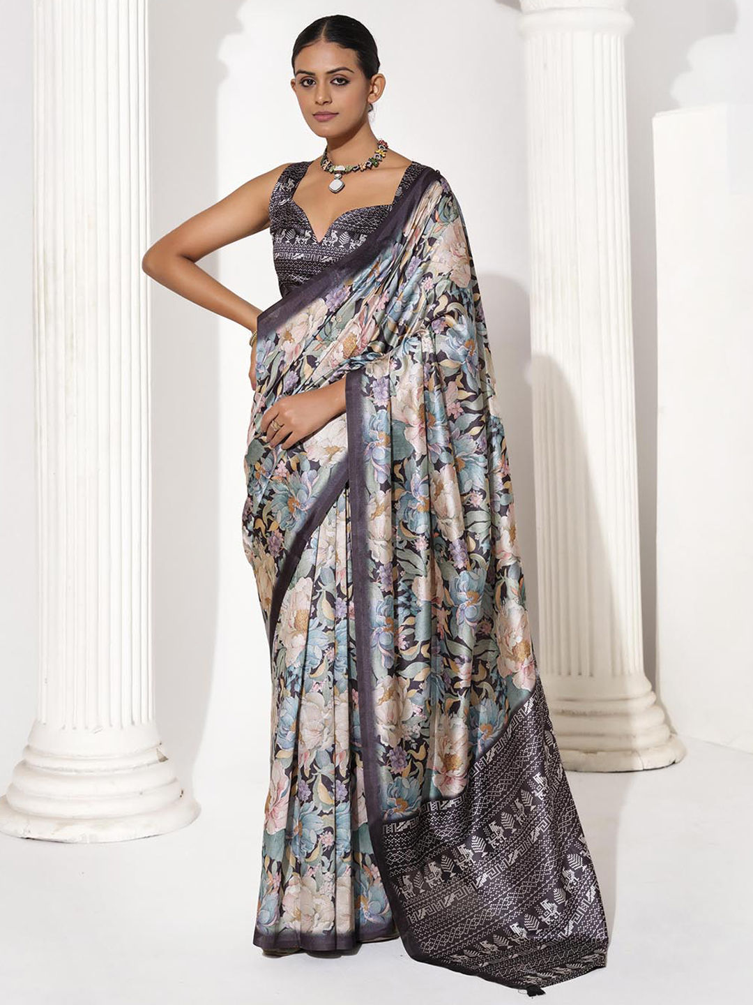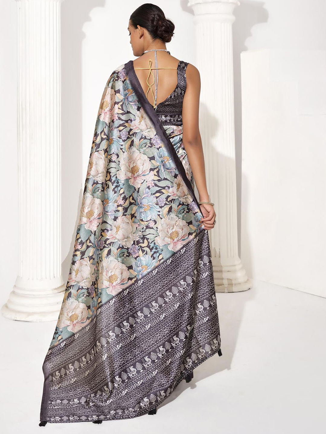 Black and Grey color Saree in Blended, Silk fabric with Floral, Printed work