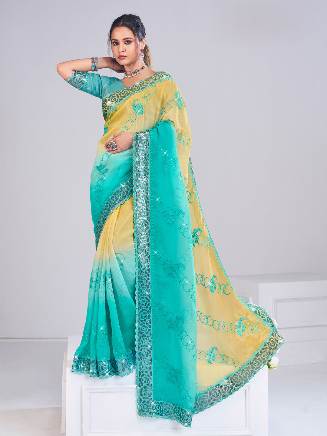 Blue, Yellow color Saree in Silk fabric with Border, Embroidered, Resham, Sequence, Thread work