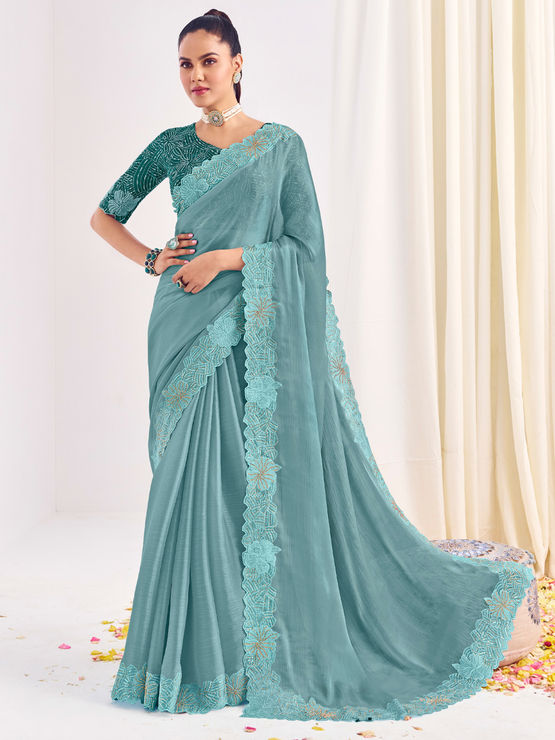 Blue color Saree in Silk fabric with Embroidered, Resham, Stone, Thread work