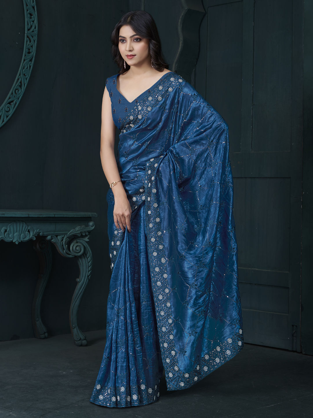 Blue color Saree in Silk fabric with Embroidered, Sequence, Stone, Thread work
