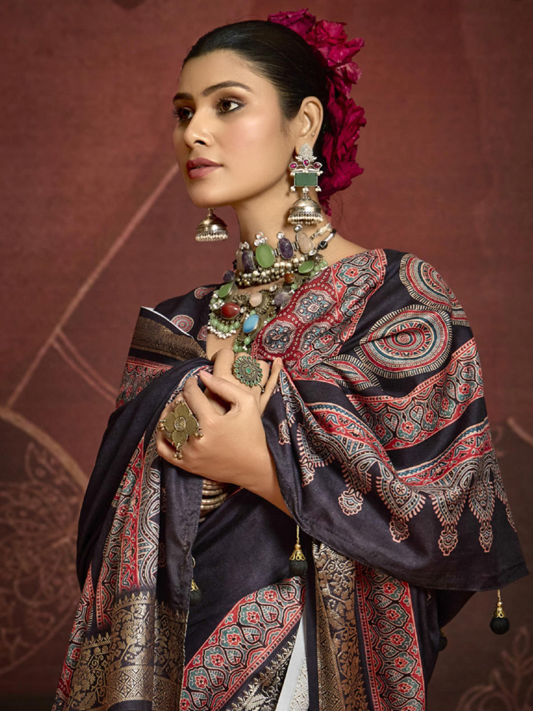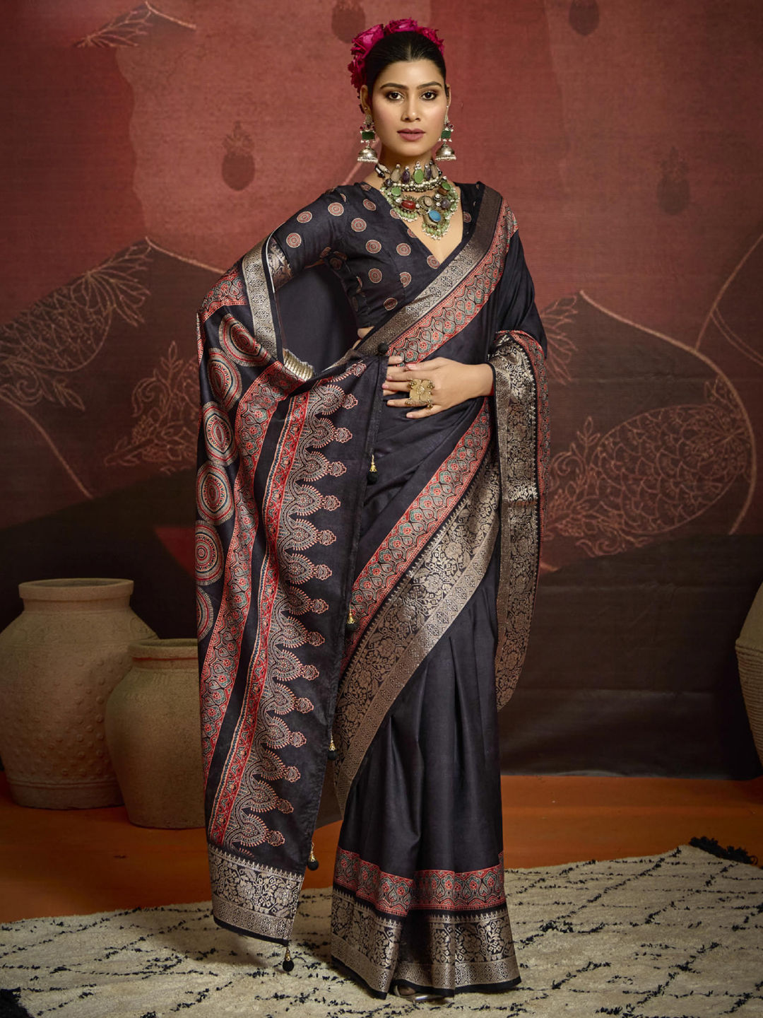 Silk Festive Saree in Black and Grey with Printed work
