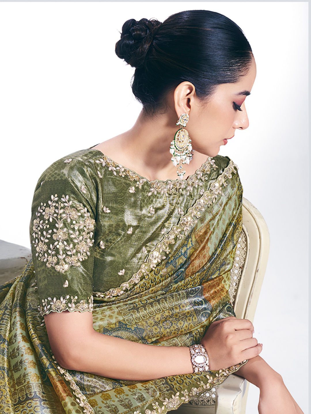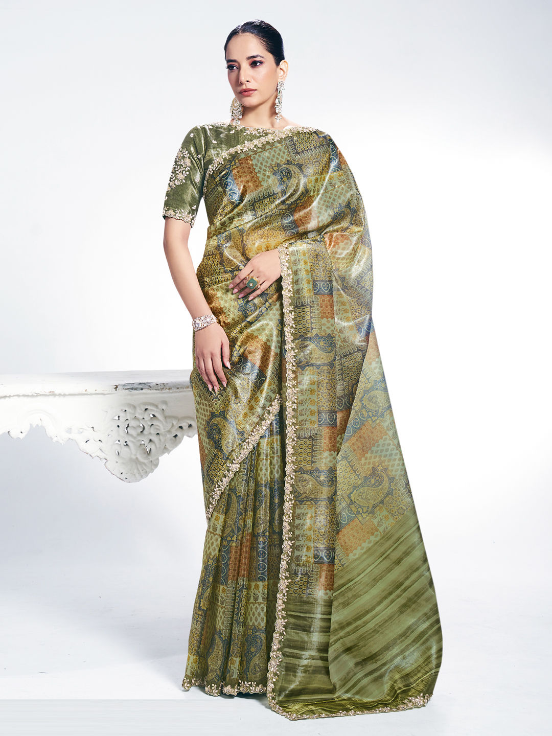 Green color Saree in Silk fabric with Digital Print, Embroidered, Stone work