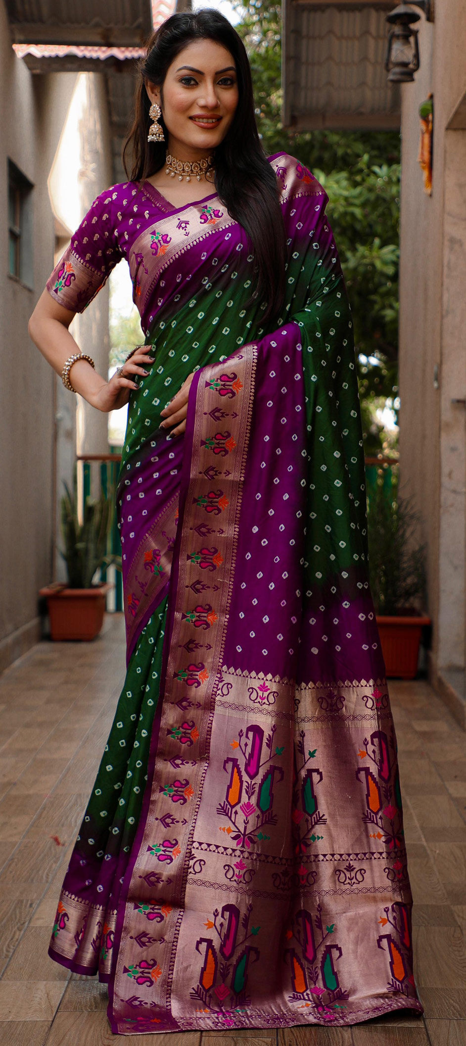 Green color Saree in Silk fabric with Bandhej, Printed, Weaving work