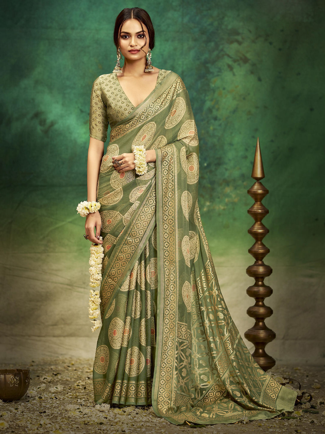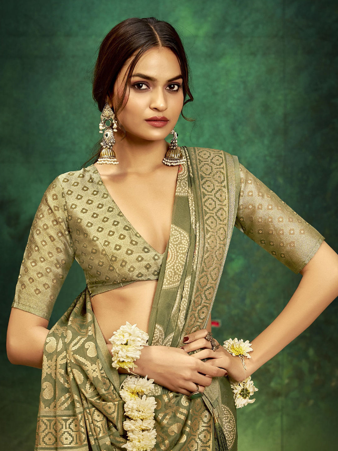 Green color Saree in Silk fabric with Bandhej, Printed, Weaving work