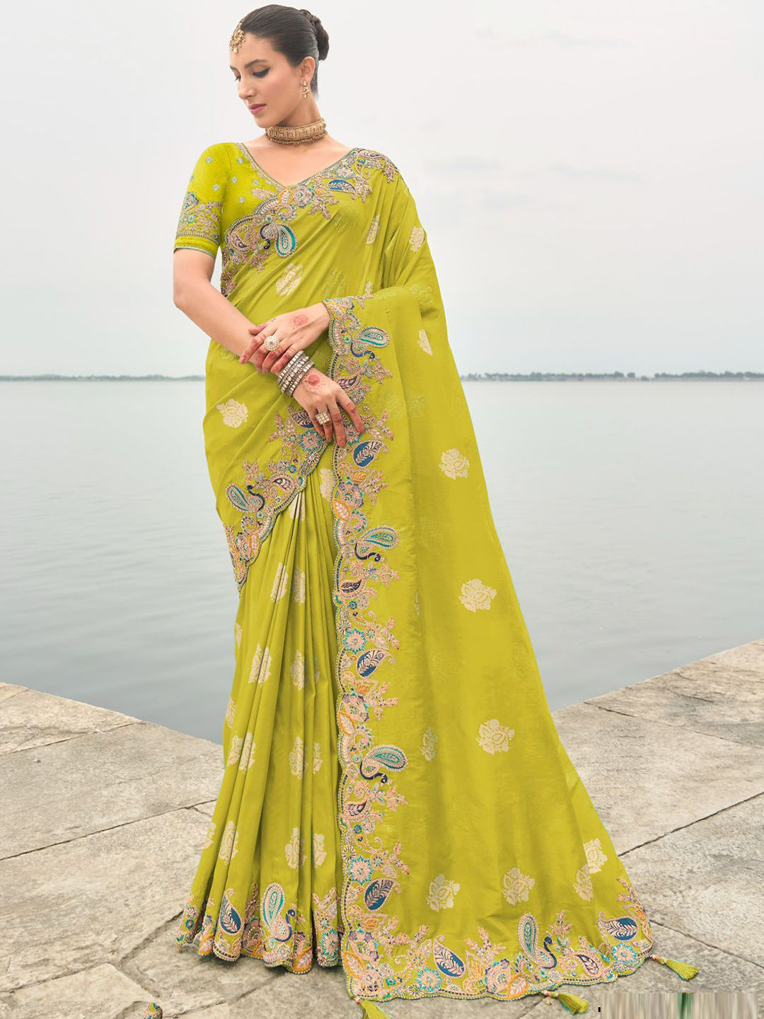 Silk Wedding Saree in Yellow with Weaving work
