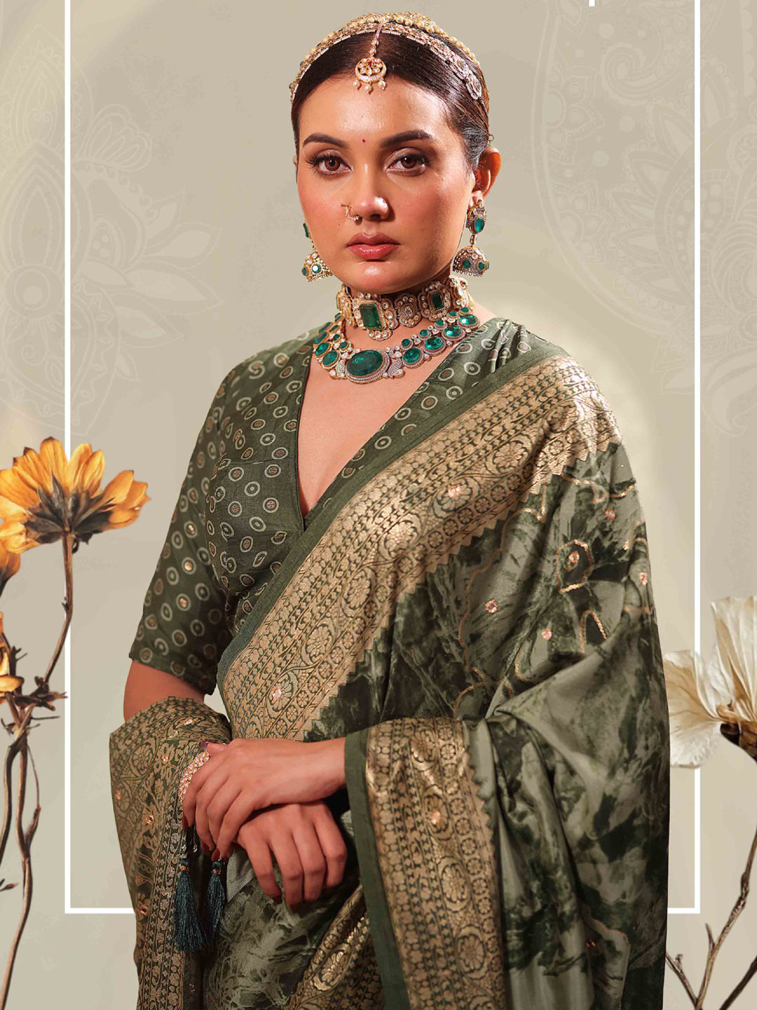Green color Saree in Silk fabric with Tye n Dye, Weaving work