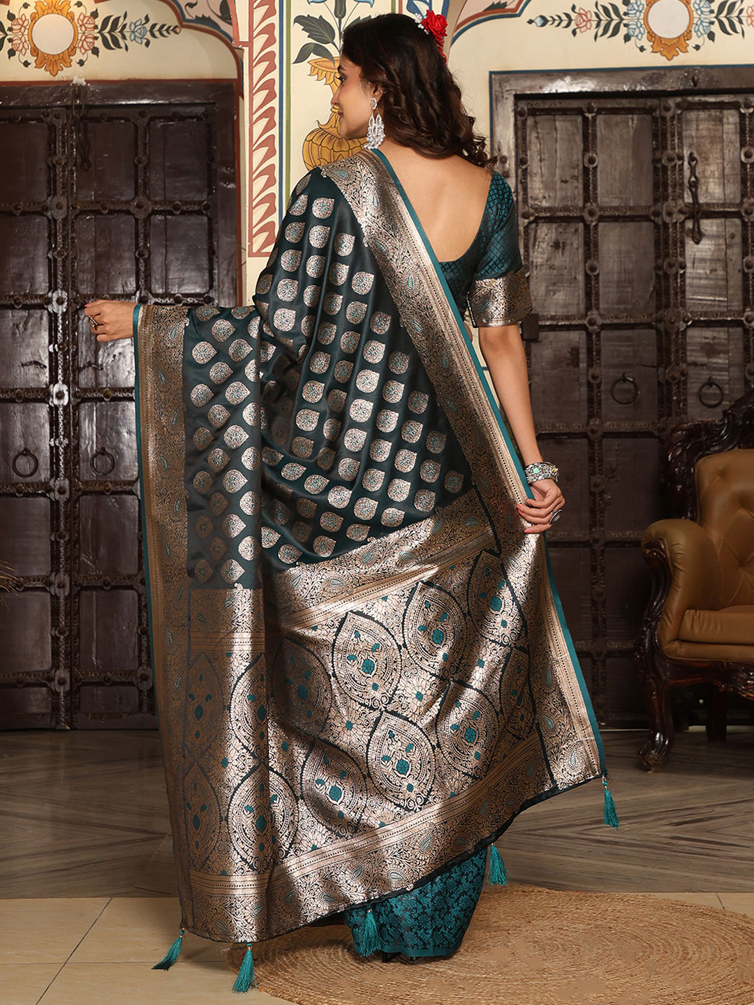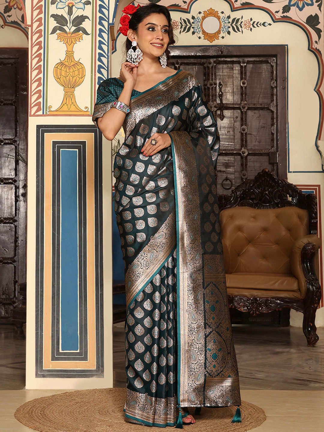 Silk Traditional Saree in Green with Weaving work
