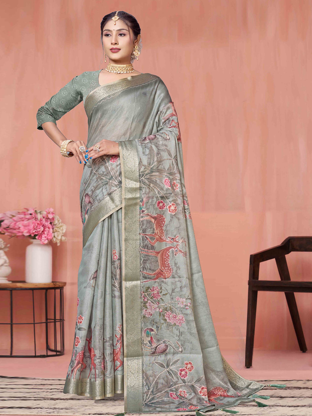 Green color Saree in Silk fabric with Floral, Printed, Weaving, Zari work