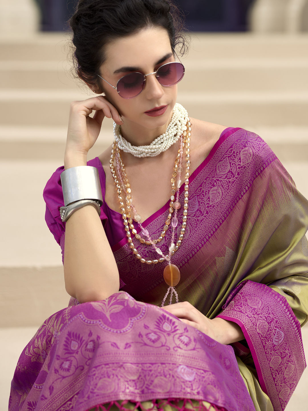 Green, Pink and Majenta color Saree in Silk fabric with Weaving work