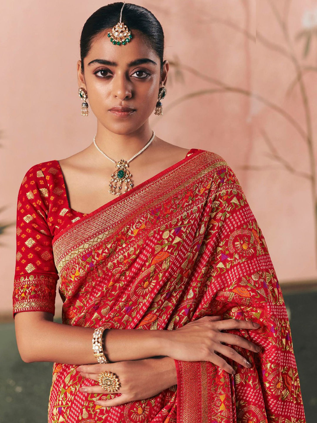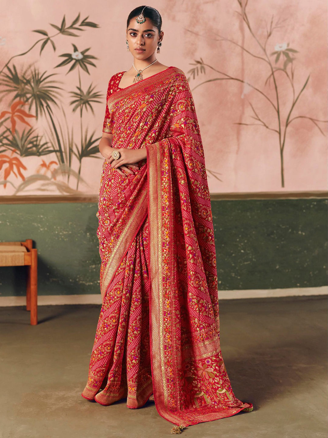 Red and Maroon color Saree in Silk fabric with Bandhej, Printed, Weaving work