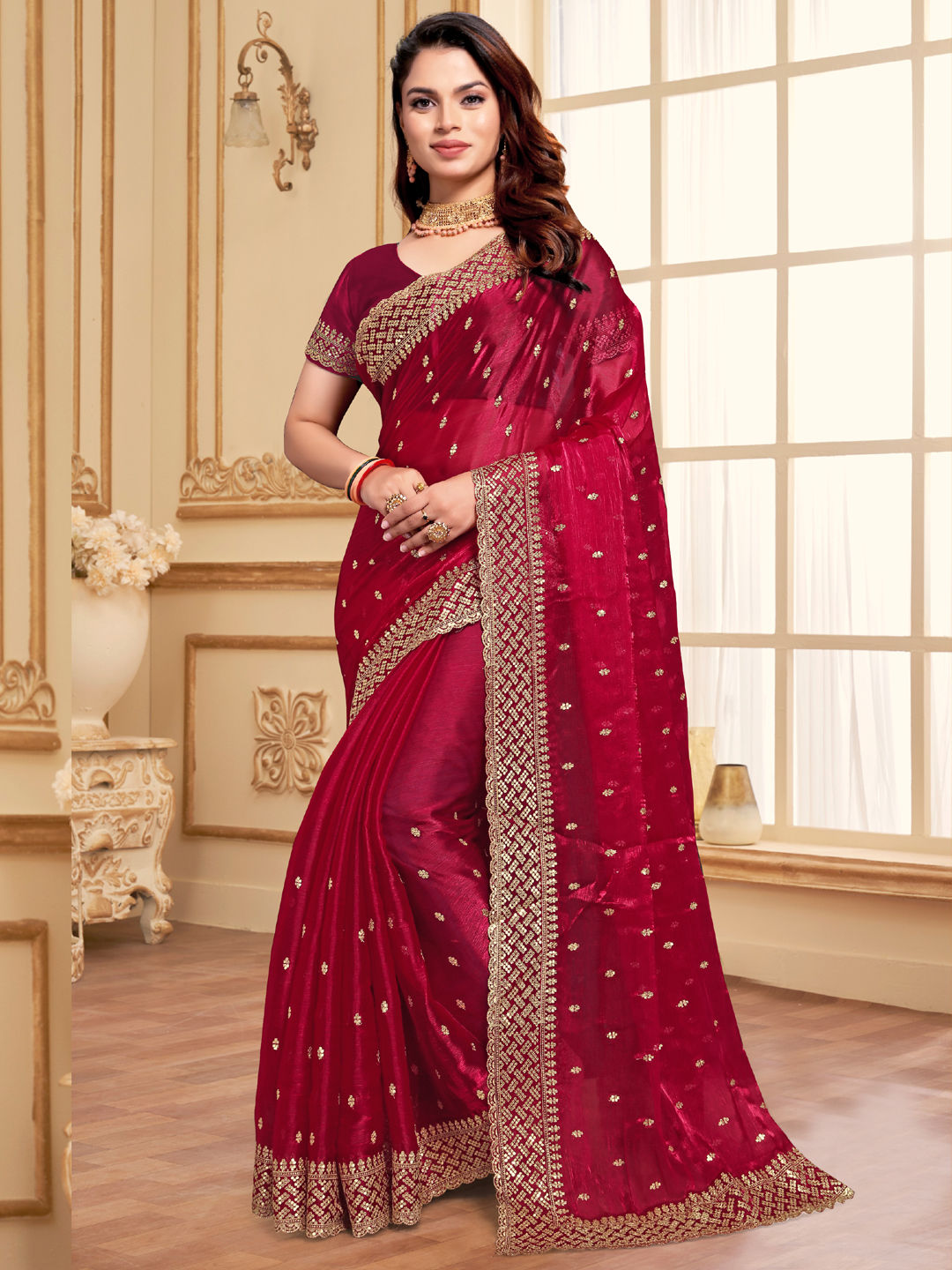 Silk Engagement Saree in Red and Maroon with Embroidered work