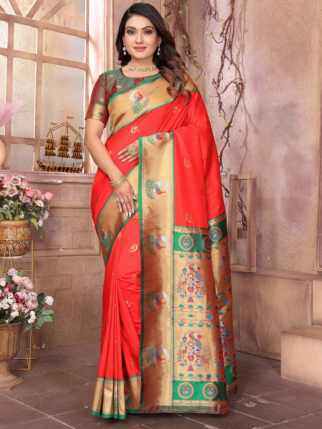 Silk Traditional Saree in Red and Maroon with Weaving work