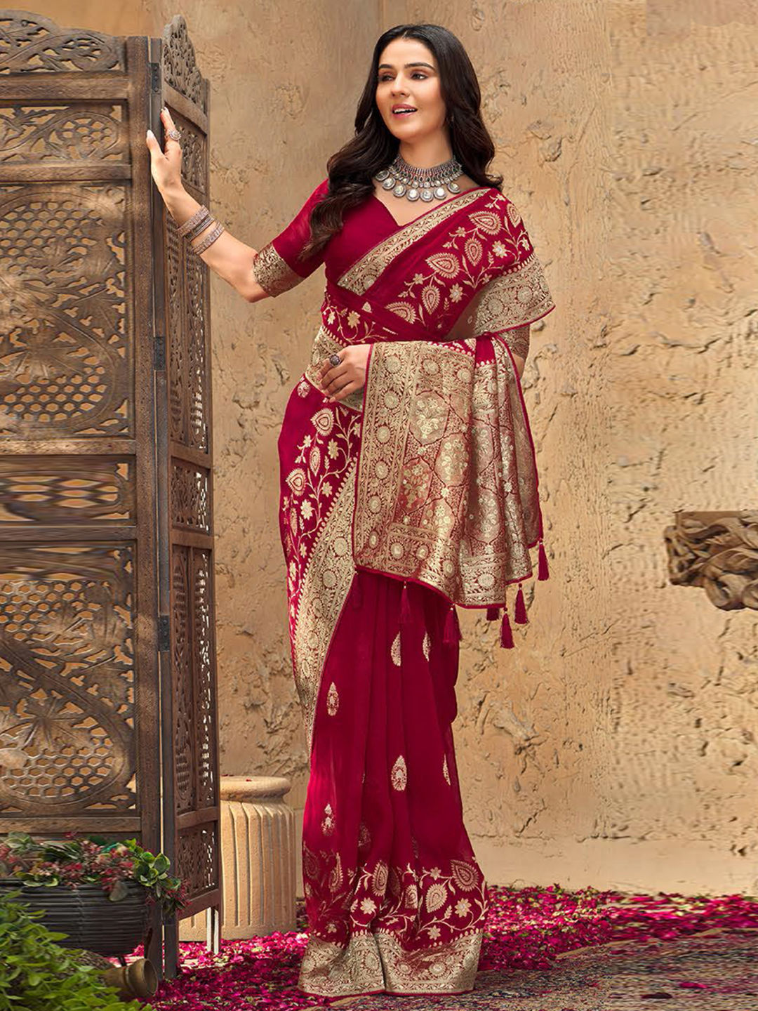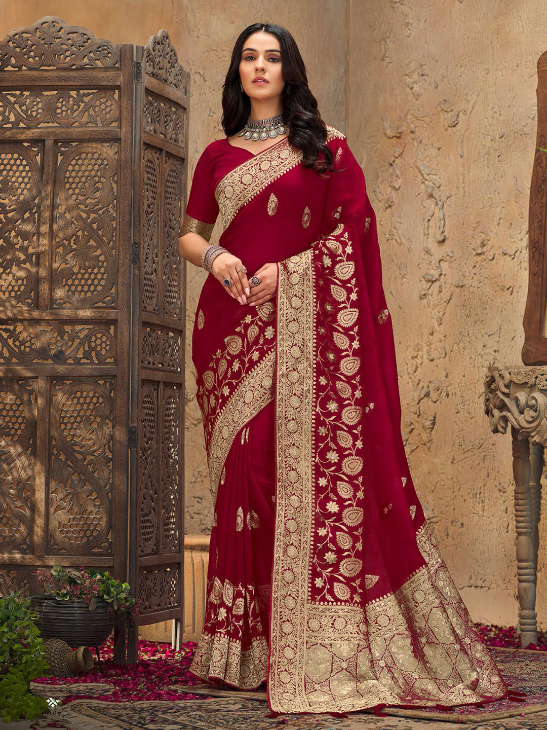 Red and Maroon color Saree in Silk fabric with Weaving work