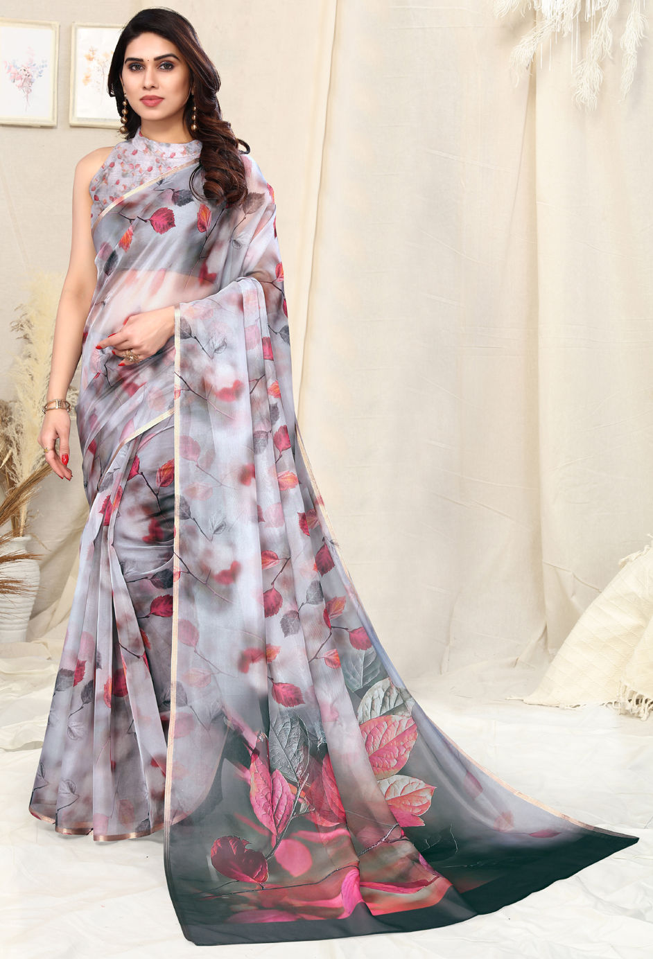 White and Off White color Saree in Organza Silk, Silk fabric with Printed work