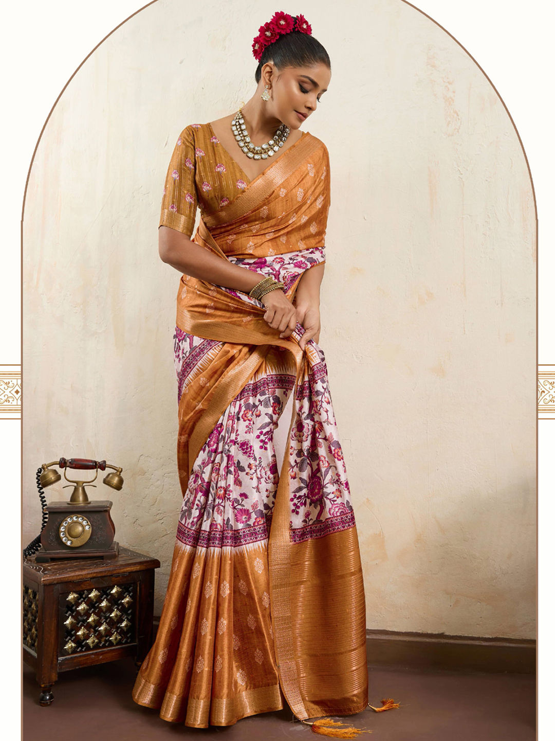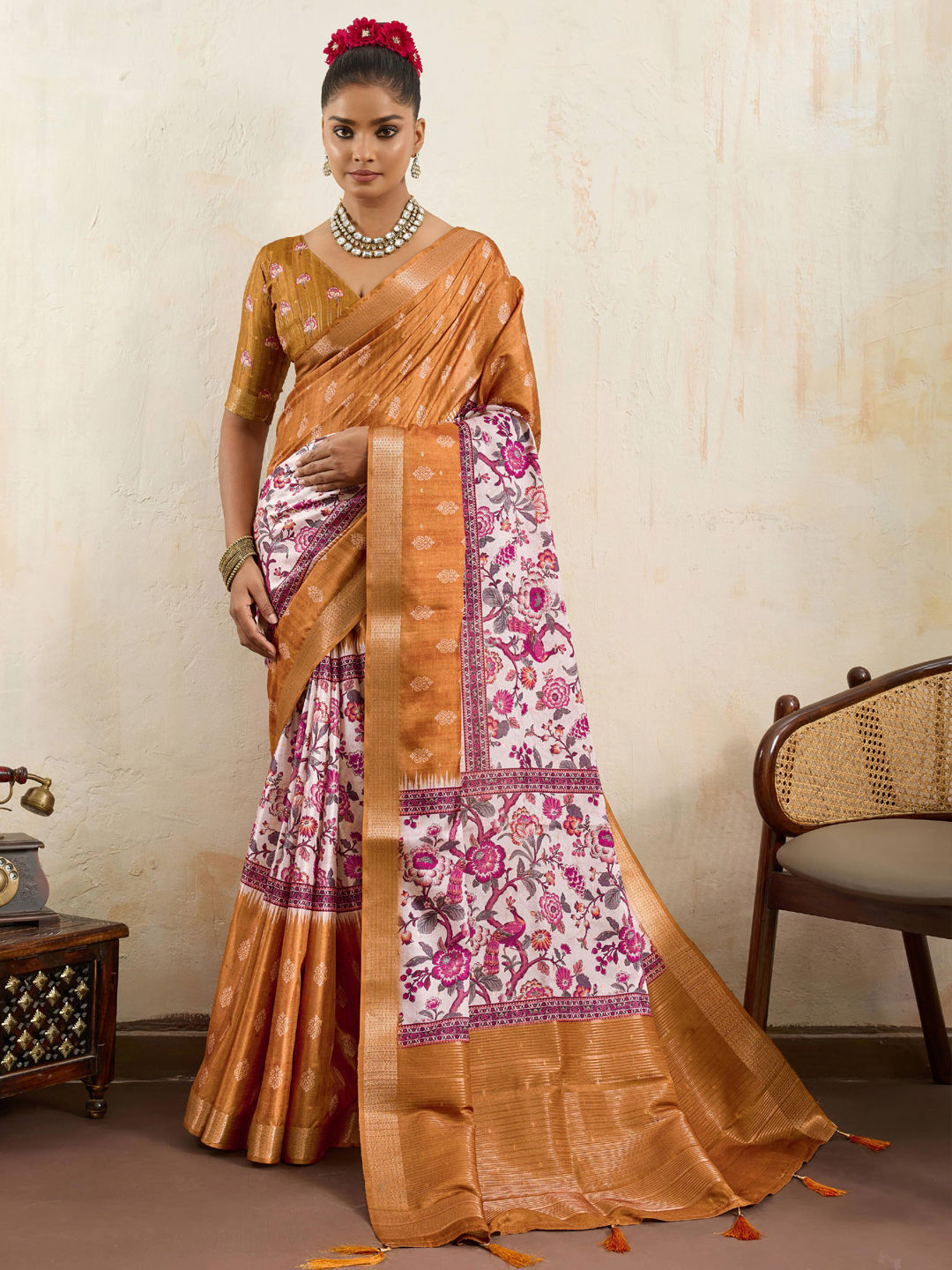 Beige and Brown, White and Off White color Saree in Silk fabric with Floral, Printed work