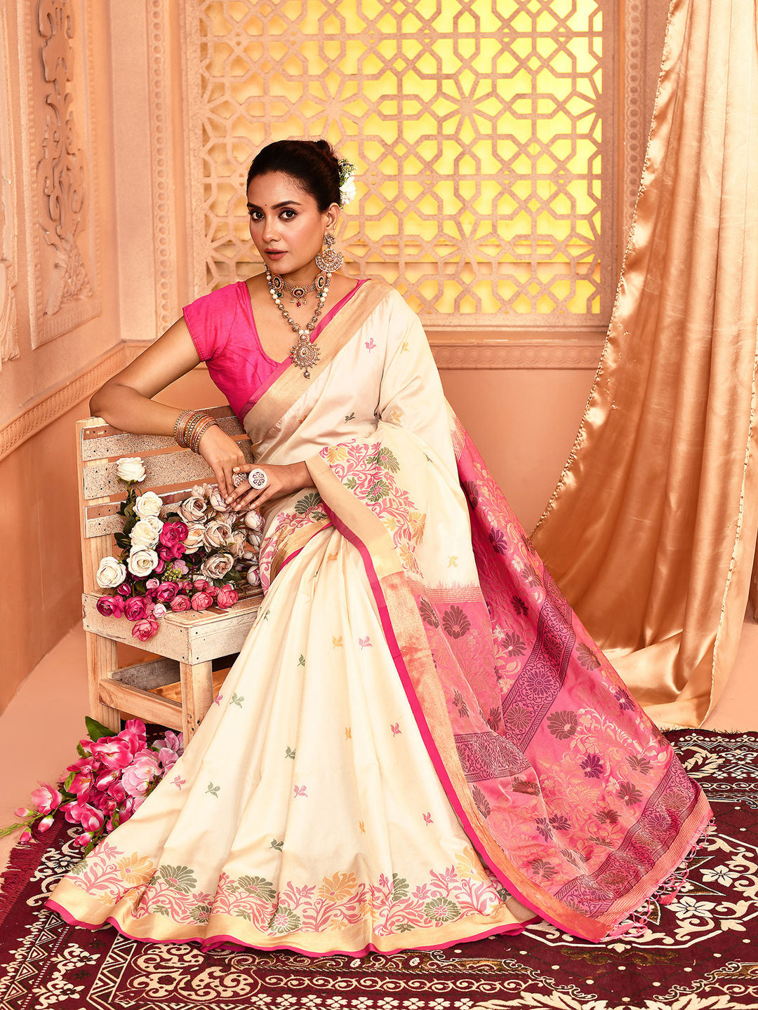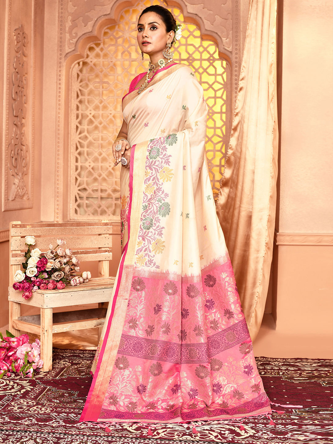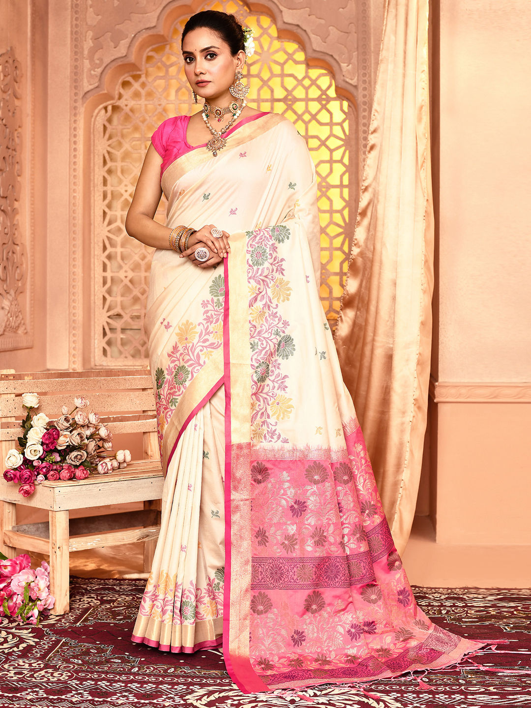 in White and Off White with Weaving work